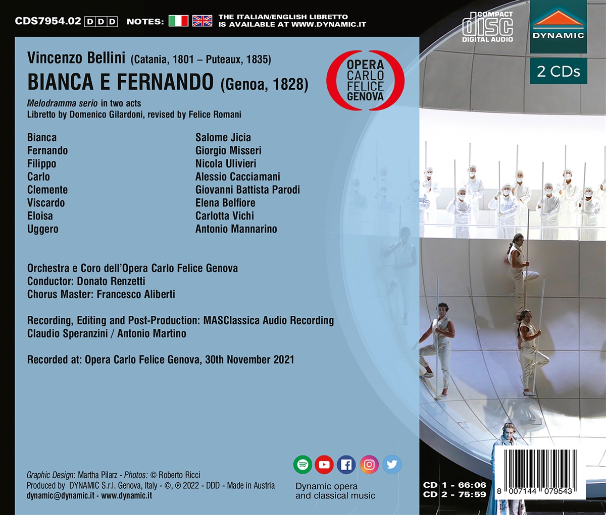 Die Komposition von „Bianca e Fernando“ wurde für die Eröffnung des Carlo-Felice-Theaters in Genua 1828 in Auftrag gegeben. Vincenzo Bellini stand am Beginn seiner Karriere, die ihn zu einem der wichtigsten Opernkomponisten des 19. Jahrhunderts formen sollte. Die wundervolle Musik zu dieser dramatischen Geschichte über die Liebe zwischen Eltern und Kindern, hinterhältige Intrigen und den Triumph über die Tyrannei wurde mit dem ‚Jubel und der Verehrung der Bürger Genuas‘ aufgenommen und von Donizetti und anderen Kollegen bewundert, so dass Bellini bald in ganz Italien und darüber hinaus bekannt wurde. Diese gefeierte erste moderne Aufführung besticht mit einigen kostbaren verloren geglaubten Teilen der Partitur.