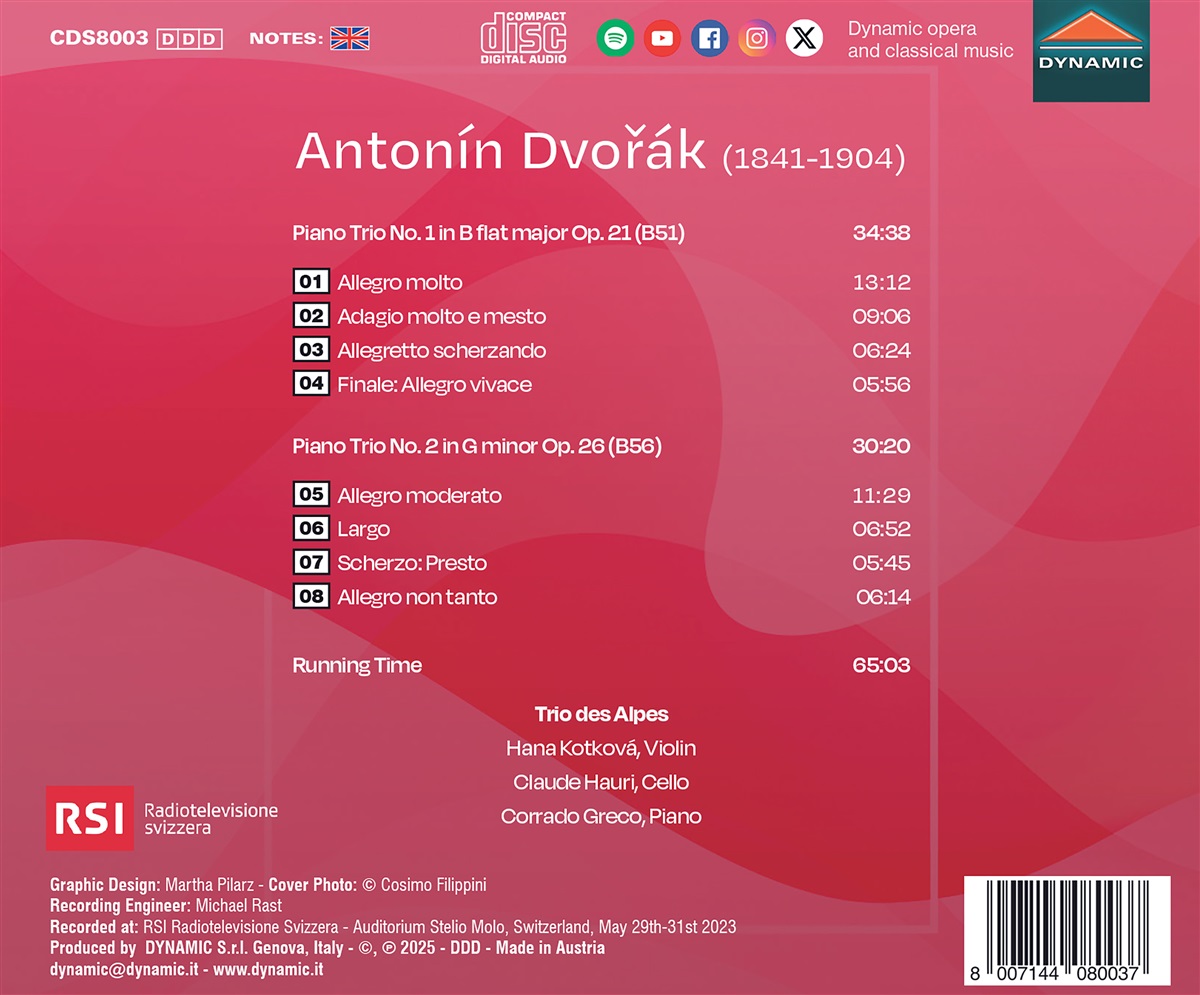 Das Trio des Alpes wurde 2010 gegründet und besteht aus drei starken Persönlichkeiten, die das ultimative Ziel der Kammermusikaufführung anstreben: drei Stimmen harmonisch in einem einzigen Klang zu verschmelzen. Ihr erstes Album bei Dynamic, das 2015 veröffentlicht wurde, enthält Werke von Beach, Boulanger und Clarke. In Koproduktion mit RSI nahmen sie außerdem Dvořáks komplette Klaviertrios auf. Der erste Teil der Reihe, der die Trios Op. 65 und Op. 90 enthält, wurde vom italienischen Magazin Musica mit 5 Sternen ausgezeichnet.