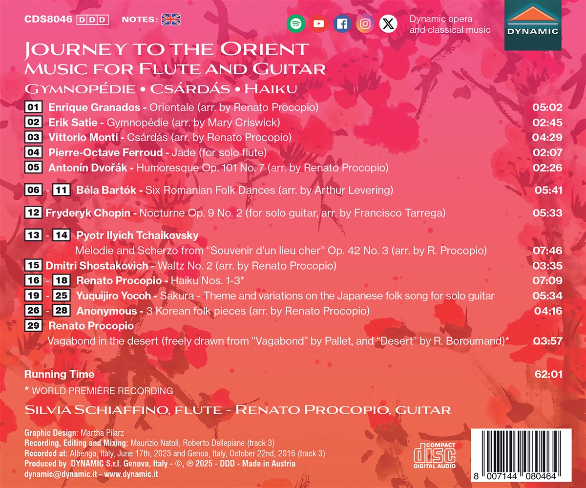 Das preisgekrönte Duo mit Flötistin Silvia Schiaffino und Gitarrist Renato Procopio präsentiert einen musikalischen Reisebericht, der von West- bis Osteuropa reicht, bevor es weiter nach Japan, Iran und Korea geht. Neben Meisterwerken wie Béla Bartóks Rumänischen Volkstänzen und einem mitreißenden Csárdás von Vittorio Monti umfasst diese stimmungsvolle Auswahl auch farbenfrohe und außergewöhnliche Stücke wie die Musik des Sakura von Yuquijiro Yocoh sowie Renato Procopios eigenes lebhaftes Arrangement koreanischer Volkslieder. Die Flötistin Silvia Schiaffino hat über 300 Konzerte als Solistin und in Kammerensembles in Italien, Frankreich, Belgien, den USA und Südamerika gegeben. Im Jahr 2018 wurde ihre Aufnahme „Vol au Vent“ mit dem Gitarristen Renato Procopio bei den Global Music Awards mit der Bronzemedaille ausgezeichnet. Der Gitarrist Renato Procopio ist Gründungsmitglied des Kammermusikensembles Esachordo sowie Mitglied von zwei Big Bands und hat für seine Klangkörper immer wieder selbst Musik komponiert und arrangiert.