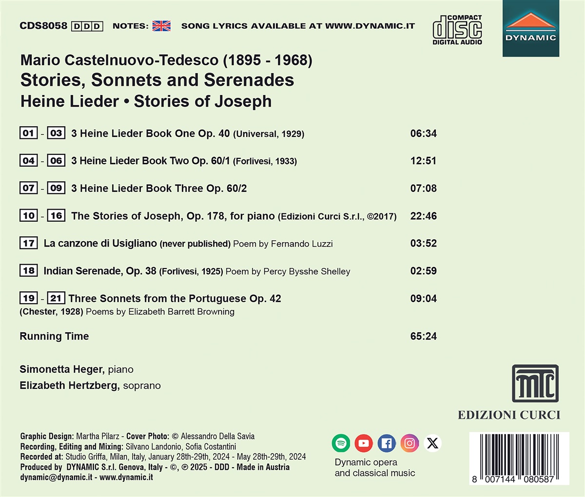 Mario Castelnuovo-Tedesco blieb stets einer tonalen Musiksprache treu. Heute ist er vor allem für seine Gitarrenwerke bekannt, aber sein Schaffen ist viel umfangreicher und vielfältiger, als allgemein angenommen wird. Castelnuovo-Tedesco wählte Heinrich Heines ironischere Gedichte für die drei hier aufgenommenen Sammlungen aus und fügte seinem Zyklus „Die Geschichten von Joseph“ unbeschwerte Zitate von Schumann und Verdi hinzu. Ebenfalls enthalten sind unveröffentlichte Lieder wie „La canzone di Usigliano“ mit seinen Anspielungen auf toskanische Volkslieder und die „Drei Sonette“ aus dem Portugiesischen, die den romantischen und träumerischen Charakter der Texte von Elizabeth Barret Browning widerspiegeln. Die aufstrebende Sopranistin Elizabeth Hertzberg singt und wird am Klavier von Simonetta Heger begleitet, die auch eine versierte Cembalistin ist.