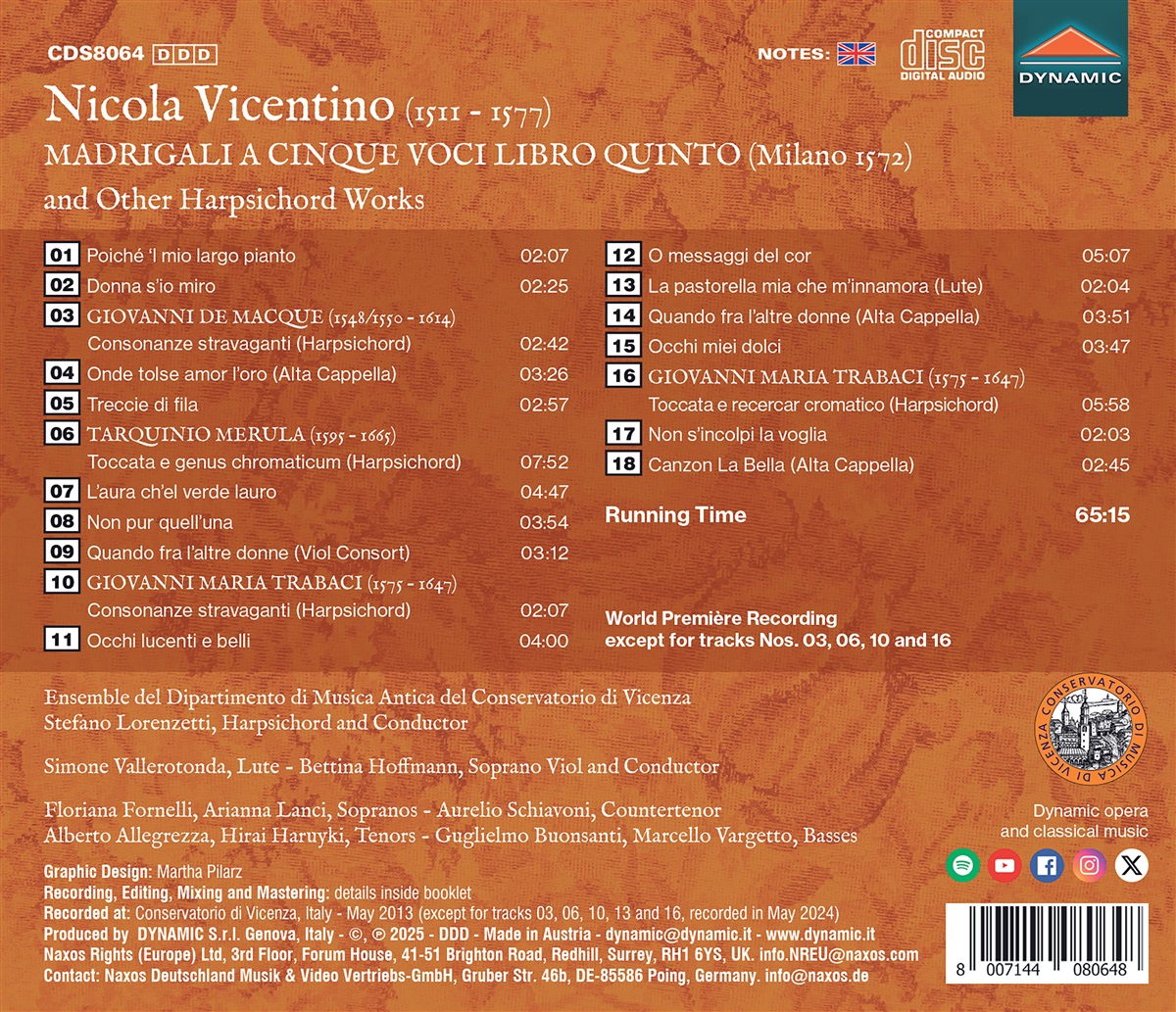 Nicola Vicentino war zu seiner Zeit als Musikwissenschaftler und Erfinder des mikrotonalen Tasteninstruments Archicembalo bekannt, doch es ist die beeindruckende harmonische Raffinesse seiner Madrigale, die seinen Namen bis heute lebendig hält. Diese Weltpremiere-Aufnahmen von Madrigalen aus dem Fünften Buch von 1572 werden durch Instrumentalstücke ergänzt, die vergleichbare chromatische Universen erkunden, darunter Giovanni Maria Trabaci bemerkenswerte „Toccata e recercar cromatico” und die erste jemals veröffentlichte instrumentale Canzona: „Canzon la Bella”. Diese Aufnahme präsentiert unter anderem das Ensemble del Dipartimento di Musica Antica del Conservatorio di Vicenza unter der Leitung von Stefano Lorenzetti, der auch Cembalo spielt.