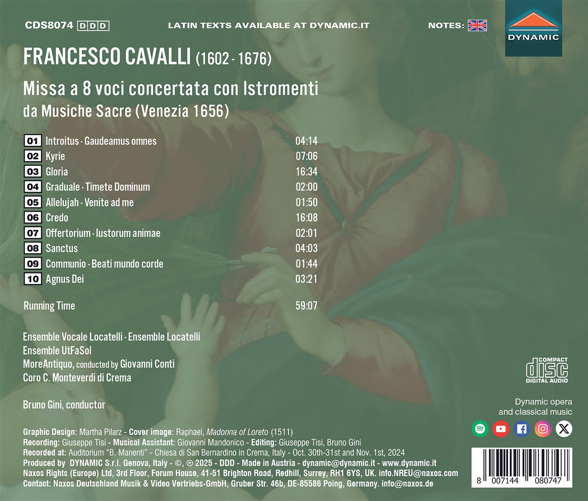 As a boy, Francesco Cavalli was a member of San Marco Basilica’s Chapel, then directed by Claudio Monteverdi, from whom he probably received tuition. In time Cavalli’s fame as an operatic composer spread across Europe and he succeeded Monteverdi in San Marco to reach the apex of success in Venice. He also wrote sacred music, published in two great printed collections. The first collection, published in 1656, contains his "Missa a 8 voci Concertata", an imposing and magnificent work of exceptional complexity for eight soloists, two four-voiced choirs and many instrumentalists. In this recording it is performed in the context of an All Saints’ Day liturgy by Ensemble Locatelli, directed by Cavalli scholar, Bruno Gini. Das Ensemble Locatelli ist ein Barockorchester, das auf historischen Instrumenten spielt. Es hat bereits mehrere Alben aufgenommen, darunter vier mit Weltpremieren und tourt durch ganz Europa.