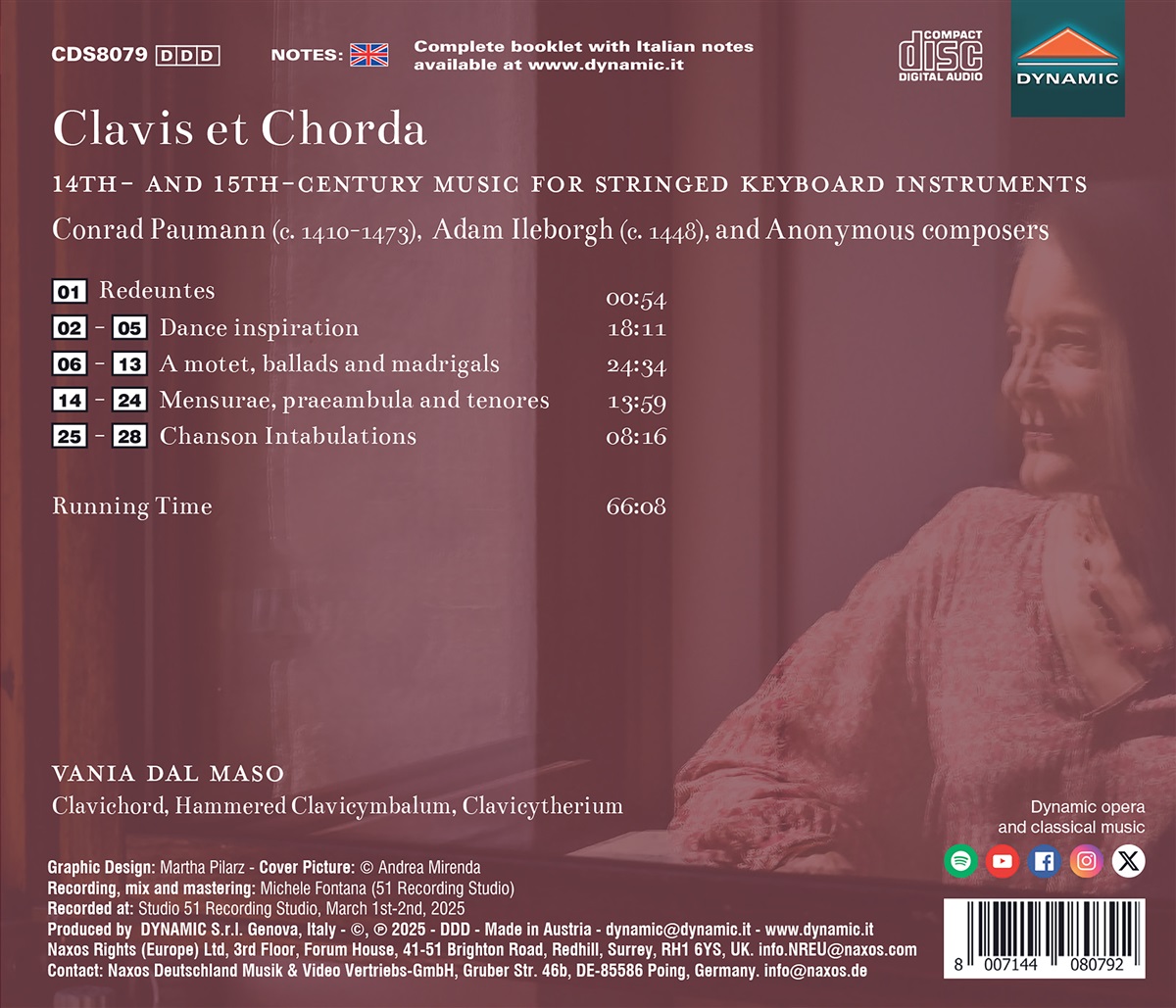 Die Musikerin und Wissenschaftlerin Vania Dal Maso hat ein innovatives Programm zusammengestellt, das sich mit der Musik für Tasteninstrumente mit Saiten aus dem 14. und 15. Jahrhundert befasst. Basierend auf Studium und Interpretation von Quellen, sowohl zur Konstruktion der Instrumente als auch zur musikalischen Interpretation, erforscht sie die grundlegend unterschiedlichen Klänge und Klangfarben des Clavichords, des Hammerklaviers und des Clavicytheriums. Die Musik umfasst ein breites Spektrum an Formen und Genres aus ganz Europa, darunter auch Stücke aus dem ältesten bekannten Manuskript für Tasteninstrumente – dem Robertsbridge-Kodex (um 1320) –, um ein möglichst umfassendes stilistisches Panorama der Tastenmusik jener Zeit zu schaffen. Sie spielt Instrumente von Paolo Zerbinatti: ein Clavichord aus dem Jahr 2010, das nach Zeichnungen und einem Text von Arnaut de Zwolle (um 1440) hergestellt wurde, ein Hammer-Clavicymbalum aus dem Jahr 2011, ebenfalls nach de Zwolle, und ein Clavicytherium aus dem Jahr 2010, das auf unbekannten Quellen aus dem späten 15. Jahrhundert basiert.