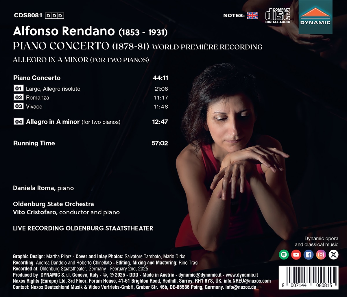Im ausgehenden 19. Jahrhundert erlebte Italien eine Renaissance der Instrumentalkomposition und an ihrer Spitze stand Alfonso Rendano, jedoch ist er heute weniger bekannt als seine Zeitgenossen Giovanni Sgambati und Giuseppe Martucci. Er war auch ein bedeutender Pianist, der mit dem berühmten Geiger Joseph Joachim auftrat. Das rapsodische Klavierkonzert, das hier erstmals in seiner Originalfassung aufgenommen wurde, wurde in einer Fassung für zwei Klaviere uraufgeführt, in der der Komponist von Franz Liszt begleitet wurde, der es als „ein kraftvolles, bemerkenswertes Werk, das ich sehr schätze“ bezeichnete. Das Allegro in a-Moll wurde 1969 wiederentdeckt und stammt aus Rendanos künstlerischer Reifezeit. Das Klavierkonzert wird in der Fassung von Vito Cristofaro aufgeführt, der es zusammen mit Rendanos führender zeitgenössischer Interpretin Daniela Roma spielt. Daniela Roma gilt als die führende Interpretin des Werks von Alfonso Rendano. Als künstlerische Leiterin des Alfonso Rendano International Music Festival in der Villa Rendano in Cosenza, Italien, hat sie die Weltpremiere von Rendanos Klavierwerken und das Quintett für Klavier und Streicher mit dem Modus String Quartet aufgenommen. Ihre Aufnahme von Alexander Skrjabins Klavierwerken aus dem Jahr 2022 wurde von der Presse hochgelobt.