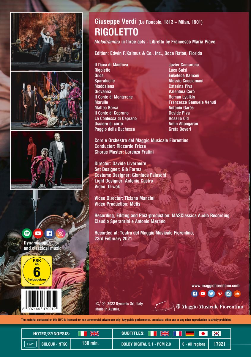 An Aufnahmen des „Rigoletto“ mangelt es wahrlich nicht. Wenn sich das italienische Label Dynamic dennoch entschlossen hat, die Aufführung aus dem Teatro del Maggio Musicale Fiorentino vom Februar 2021 auf DVD, Blu-ray, CD und digital zu veröffentlichen, dann gibt es dafür (mindestens) zwei exzellente Gründe: Zum einen ist da die fantastische Leitung von Riccardo Frizza am Pult, der mit Respekt und Sorgfalt Verdis Musik zum Strahlen bringt, zum anderen sind es die phänomenal besetzten Hauptrollen mit Enkeleda Kamani als Gilda, Javier Camerena als Duca und Luca Salsi in der Titelrolle.