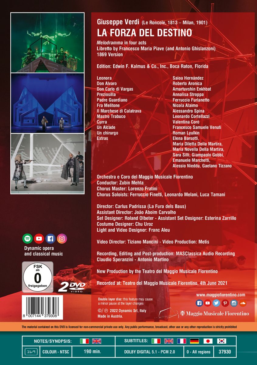 Das St. Petersburger Premieren-Publikum war sowohl an die italienische Oper des 18. Jahrhunderts als auch an die französische Grand Opéra gewöhnt, und so komponierte Giuseppe Verdi 1862 mit „La forza del destino“ ein Werk, das eine Synthese aus aristokratischem Drama und populärer Komödie darstellt. Im Jahr 1869 überarbeitete er die Oper so, dass sie mit Tod und Verklärung endet. Zubin Mehta dirigierte diese überarbeitete Fassung während des Maggio Musicale Fiorentino im Juni 2021. Für die moderne, innovative Inszenierung zeichnet sich der Regisseur Carlus Padrissa verantwortlich, Gründungsmitglied der weltberühmten katalanischen Theatergruppe La Fura dels Baus.