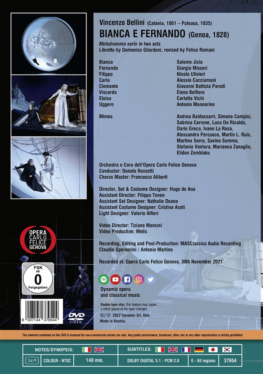 Die Komposition von „Bianca e Fernando“ wurde für die Eröffnung des Carlo-Felice-Theaters in Genua 1828 in Auftrag gegeben. Vincenzo Bellini stand am Beginn seiner Karriere, die ihn zu einem der wichtigsten Opernkomponisten des 19. Jahrhunderts formen sollte. Die wundervolle Musik zu dieser dramatischen Geschichte über die Liebe zwischen Eltern und Kindern, hinterhältige Intrigen und den Triumph über die Tyrannei wurde mit dem ‚Jubel und der Verehrung der Bürger Genuas‘ aufgenommen und von Donizetti und anderen Kollegen bewundert, so dass Bellini bald in ganz Italien und darüber hinaus bekannt wurde. Diese gefeierte erste moderne Aufführung besticht mit einigen kostbaren verloren geglaubten Teilen der Partitur.