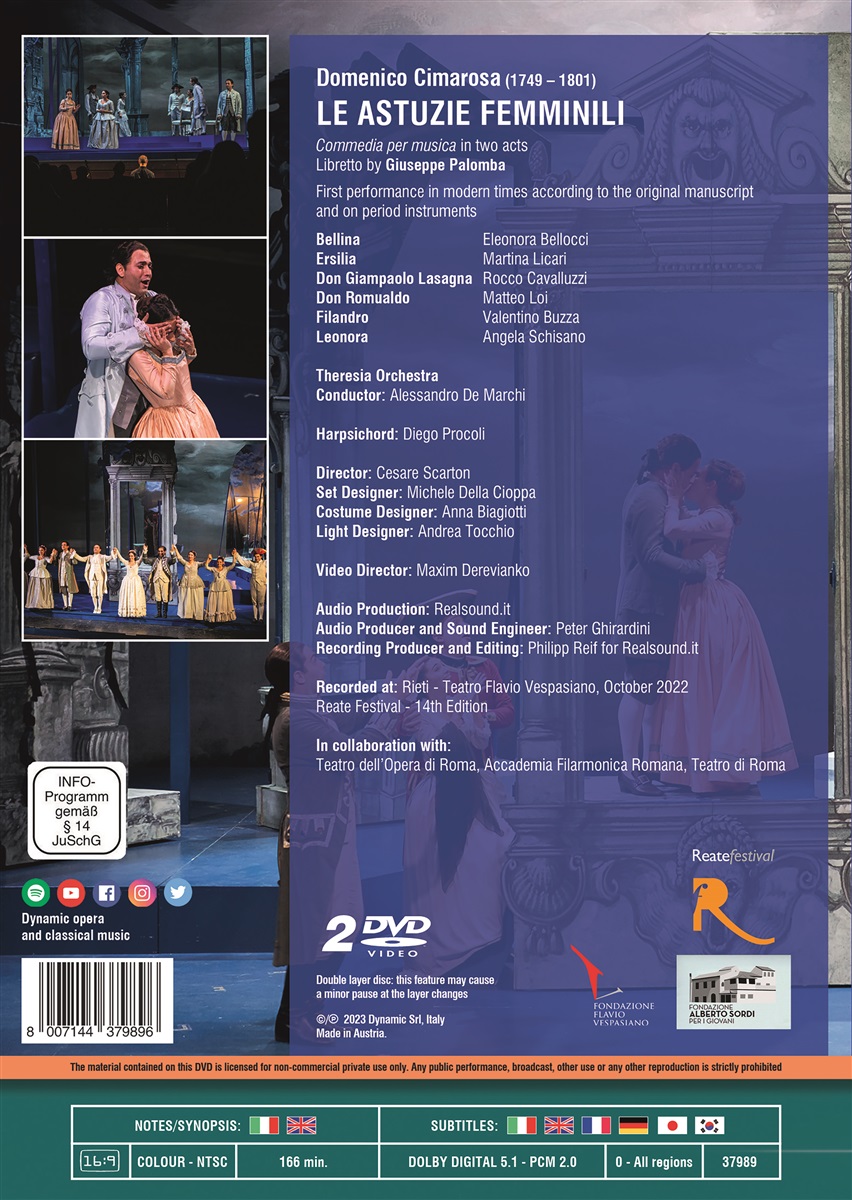 Domenico Cimarosas Commedia per musica „Le astuzie femminili“ handelt von der klugen und einfallsreichen Bellina, die einen Plan schmiedet, wie sie eine ungewollte Heirat verhindert, stattdessen ihren Geliebten Filandro heiratet und gleichzeitig an ein großes Erbe gelangt. Natürlich mangelt es dabei nicht an komischen Situationen. Die Aufnahmen stammen vom Reate-Festival 2022, dort erfreute sich das Publikum einer ausgesprochen gelungenen schwungvollen Aufführung. Die rein italienische Sänger-Riege wird von Martina Licari und Rocco Cavalluzzi angeführt.