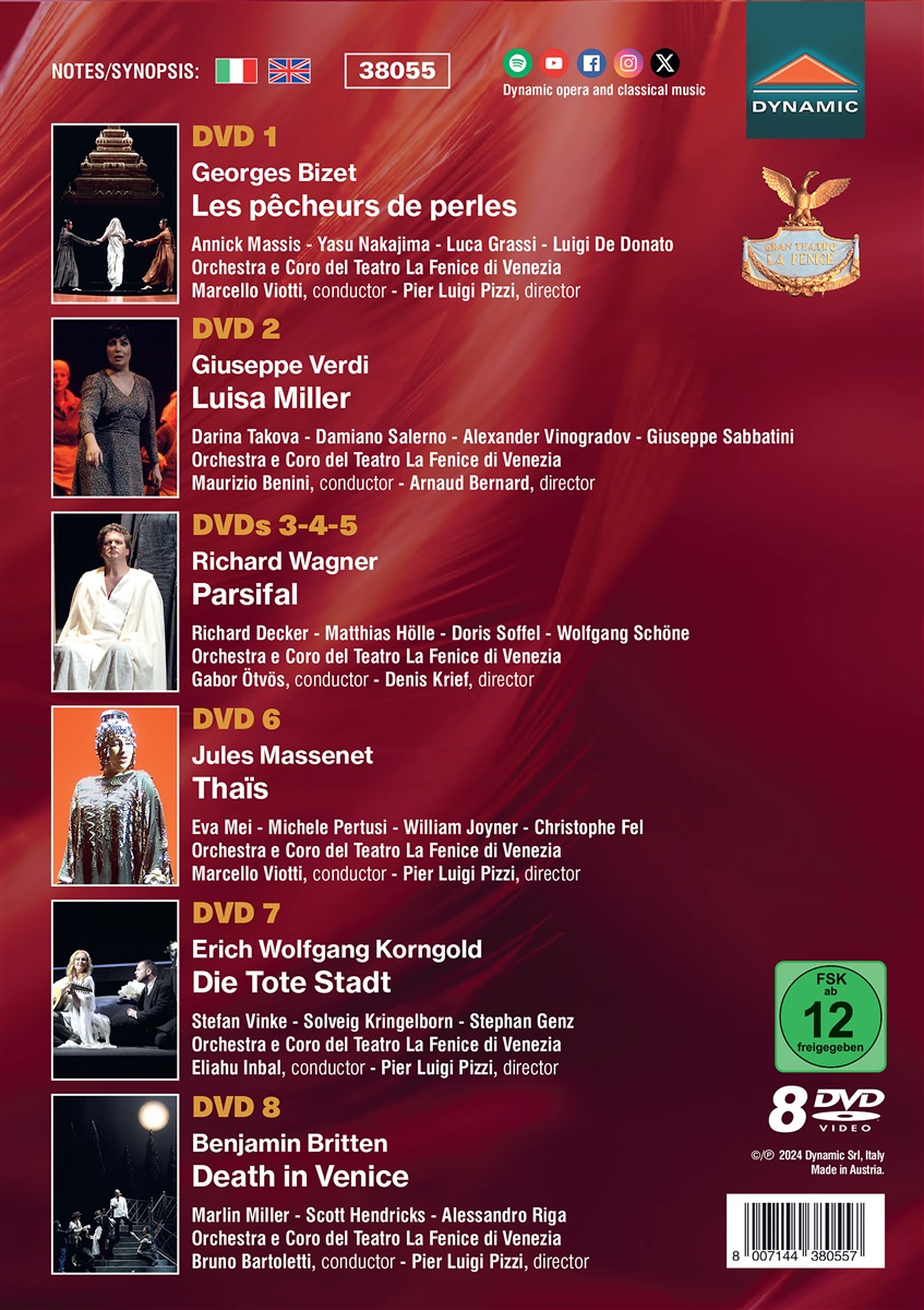 Das Teatro La Fenice in Venedig kann auf eine lange Tradition von Opernproduktionen zurückblicken, die bis ins Jahr 1792 zurückreicht. Diese Sammlung bringt die Live-Atmosphäre und die Dramatik von sechs Opern-Meisterwerken aus einem Theaterauf den Bildschirm, das mehr als nur den üblichen Anteil an Uraufführungen erlebt hat. Diese Sammlung enthält die Romantik des 19. Jahrhunderts mit Bizets „Les Pêcheurs de perles“, das intensive Drama aus Verdis „Luisa Miller“, Brittens beklemmend zurückhaltendes „Death In Venice“, Massenets tragische Geschichte von Liebe und Erlösung „Thaïs“, Wagners letzte Oper „Parsifal“ und Korngolds „Die tote Stadt“, einer der größten Opernerfolge der 1920er Jahre. Opernkunst aus rund 100 Jahren ist in diesen gefeierten Produktionen aus Venedigs legendärem Opernhaus zu sehen und zu hören.