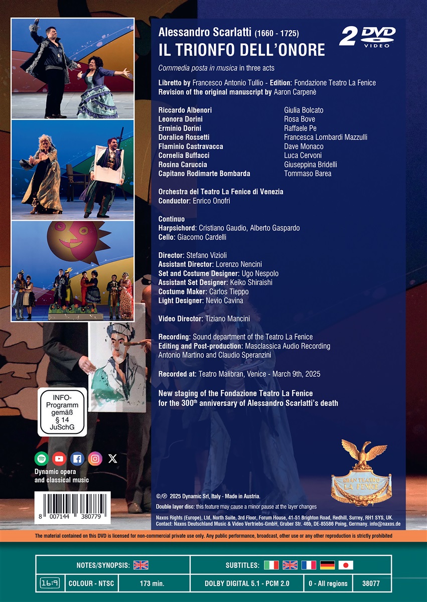 Alessandro Scarlattis „Il trionfo dell’onore” (Der Triumph der Ehre) – seine einzige komische Oper – wurde 1718 in Neapel uraufgeführt. Mit ihren charakteristischen Rezitativen und ausdrucksstarken Arien und einer Handlung über vier Liebespaare, kann sie als eine der Vorläuferinnen der Opera buffa angesehen werden. Die Hauptfigur ist der unverbesserliche Verführer Riccardo Albenori, eine Don Giovanni-ähnliche Figur, allerdings ohne die bösartige Aura. In dieser Oper besticht Scarlatti nicht nur durch einfühlsame Psychologie, sondern auch durch eine reiche Vielfalt an Arien, Duetten und Quartetten, die sowohl Pathos als auch Humor und Erotik des Werks ausmachen. Die Presse lobte die Regie von Stefano Vizioli und die farbenfrohen Bühnenbilder und Kostüme von Ugo Nespolo. Der Dirigent Enrico Onofri wurde dafür gelobt, dass er dem Orchestra del Teatro La Fenice eine Vitalität verlieh, die mit den spritzigen Gesangsnummern harmonierte.