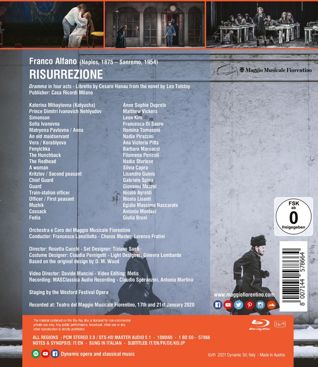 Franco Alfanos Oper „Risurrezione“ ist inspiriert von Tolstois Roman „Auferstehung“ und war gleichsam das Werk, das Alfanos beachtlichen Erfolg als Komponist bescherte. Musikalisch lehnt sich „Risurrezione“ an die großen Opern Strauss‘ und Puccinis an: Ein sich unaufhaltsam entwickelndes Drama mit lyrischen Momenten und einer markanten, suggestiven Orchestrierung. Nach der Album-Fassung (CDS7866) erschein nun die Oper als DVD und Blu-ray. Die Inszenierung Rosetta Cucchis bezeichnete die Presse als „ziemlich beeindruckend“ (Classical Music Daily).