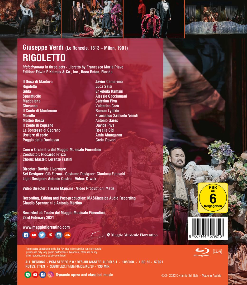 An Aufnahmen des „Rigoletto“ mangelt es wahrlich nicht. Wenn sich das italienische Label Dynamic dennoch entschlossen hat, die Aufführung aus dem Teatro del Maggio Musicale Fiorentino vom Februar 2021 auf DVD, Blu-ray, CD und digital zu veröffentlichen, dann gibt es dafür (mindestens) zwei exzellente Gründe: Zum einen ist da die fantastische Leitung von Riccardo Frizza am Pult, der mit Respekt und Sorgfalt Verdis Musik zum Strahlen bringt, zum anderen sind es die phänomenal besetzten Hauptrollen mit Enkeleda Kamani als Gilda, Javier Camerena als Duca und Luca Salsi in der Titelrolle.