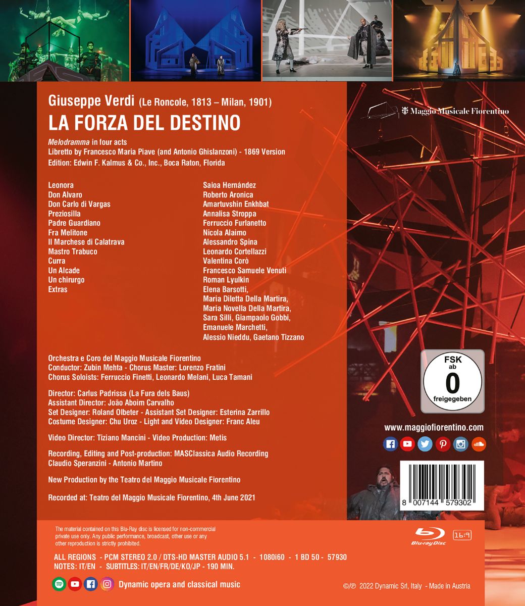 Das St. Petersburger Premieren-Publikum war sowohl an die italienische Oper des 18. Jahrhunderts als auch an die französische Grand Opéra gewöhnt, und so komponierte Giuseppe Verdi 1862 mit „La forza del destino“ ein Werk, das eine Synthese aus aristokratischem Drama und populärer Komödie darstellt. Im Jahr 1869 überarbeitete er die Oper so, dass sie mit Tod und Verklärung endet. Zubin Mehta dirigierte diese überarbeitete Fassung während des Maggio Musicale Fiorentino im Juni 2021. Für die moderne, innovative Inszenierung zeichnet sich der Regisseur Carlus Padrissa verantwortlich, Gründungsmitglied der weltberühmten katalanischen Theatergruppe La Fura dels Baus.