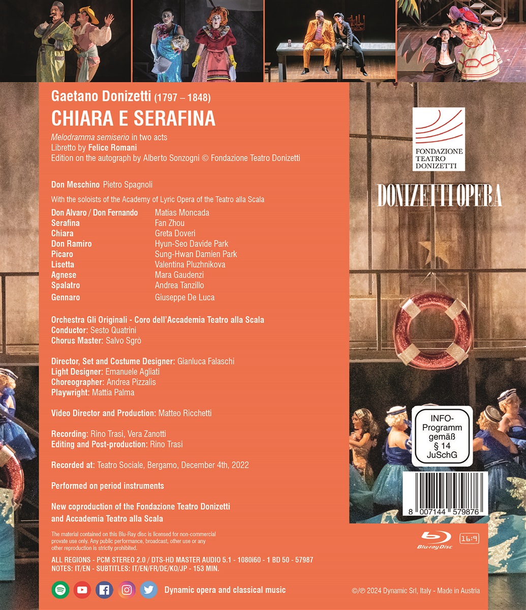 Trotz der begeisterten Reaktionen auf seine ersten Opern war Gaetano Donizetti noch jung und ziemlich unerfahren, als er 1822 den Auftrag erhielt, „Chiara e Serafina“ für die Mailänder Scala zu schreiben. Das in aller Eile komponierte Werk stieß bei der Premiere vornehmlich auf Ablehnung und verschwand danach spurlos. Dank der Wiederaufführung beim Donizetti-Festival in Bergamo kehrte „Chiara e Serafina“ schließlich nach genau 200 Jahren auf die Bühne zurück - mit einer prächtigen Inszenierung, die eine unterhaltsame Geschichte über Piraten, Liebhaber, Verkleidungen, Betrug und Gefahren im Mallorca des 17. Jahrhundert erzählt.