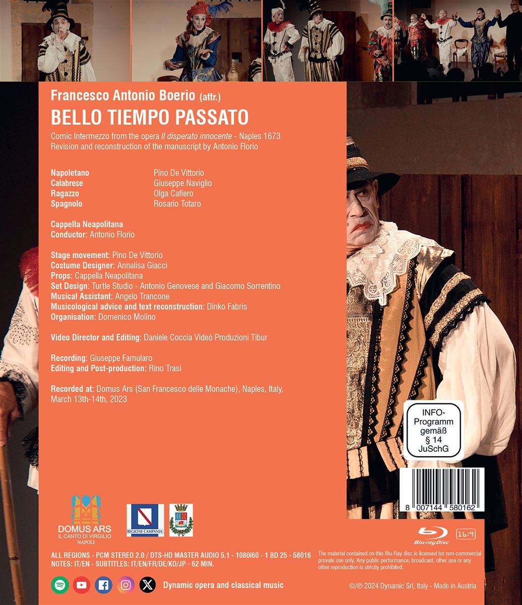 In den frühen 1670er Jahren, kurz nachdem sich die venezianische Oper in Neapel etabliert hatte, begann eine Reihe komischer Theaterfiguren in die weltlichen und geistlichen Opern zu diffundieren. Zu diesen Protagonisten gehörten ‚der Neapolitaner‘, ‚der Kalabrier‘ und ‚der Junge‘. Diese drei Archetypen und ein vierter, ‚der Spanier‘, tauchen im komischen Intermezzo „Bello tiempo passato“ auf. Es gehört zur Oper „Il disperato innocente“ des wenig bekannten Francesco Antonio Boero von 1673. Es ist das älteste erhaltene neapolitanische, komische Intermezzo und Vorbild für weitere Zwischenspiele, die zur Blaupause für die neapolitanische Oper wurden.
