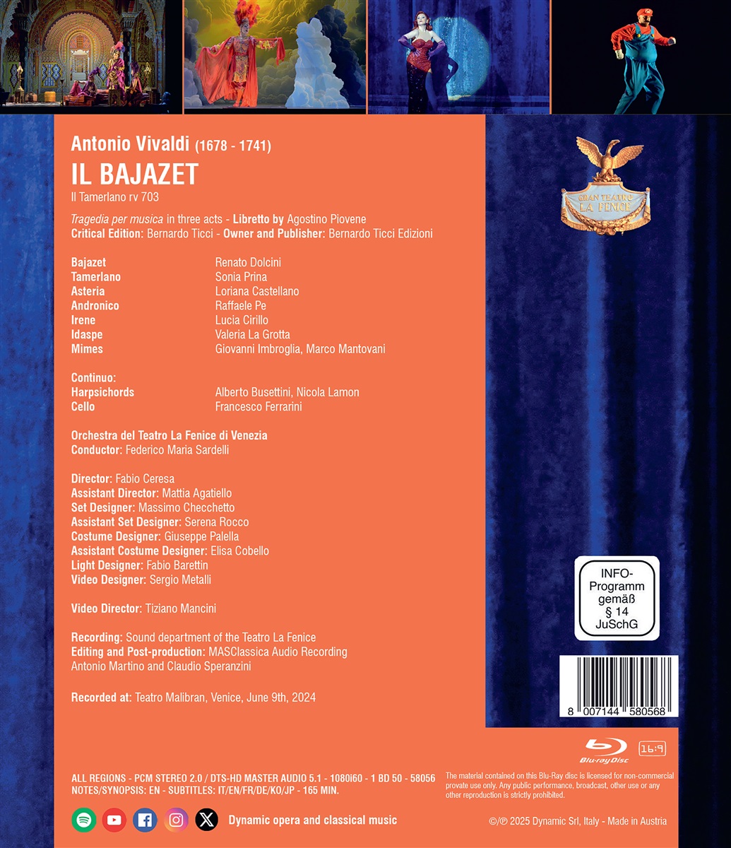 „Bajazet“ war ein Werk aus Antonio Vivaldis Spätphase, eine dramatische Erzählung, die von der Gefangennahme des türkischen Sultans Bajazet durch den alles erobernden Tataren Timur Lenk handelt. Es handelt sich um ein Pasticcio, eine etablierte Form, in die Vivaldi Arien einiger der größten jungen Komponisten seiner Zeit – Johann Adolf Hasse, Geminiano Giacomelli und Riccardo Broschi, Bruder des berühmten Kastraten Farinelli – einfließen ließ, um ein reichhaltiges musikalisches Feuerwerk zu schaffen. Dennoch bilden Vivaldis Rezitative, Chöre und Arien das Rückgrat der Oper und machen den Großteil der Musik aus, wodurch ein Werk kaleidoskopischer Erfindungsgabe entsteht. Die Oper wurde im Juni 2024 im Teatro Malibran in Venedig, gefilmt und aufgenommen – eine Weltpremiere auf Video. Federico Maria Sardelli, der mit dem Gonfalone d'Argento, der höchsten Ehrenmedaille der Toskana, ausgezeichnet wurde, dirigierte das Orchester des Teatro La Fenice di Venezia. Das Publikum war von der herausragenden Besetzung mit Renato Dolcini, Sonia Prina, Loriana Castellano und Raffaele Pe begeistert.
