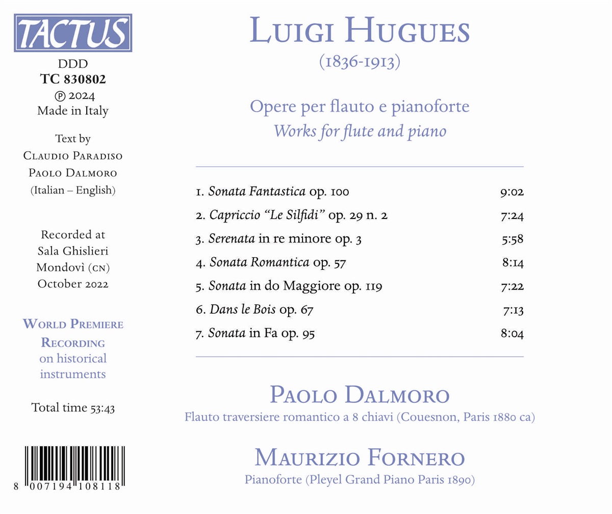 Zu den interessantesten Persönlichkeiten, die in der Musikwelt des Italiens des späten 19. Jahrhunderts wiederentdeckt werden müssen, gehört zweifellos der piemontesische Komponist Pietro Eugenio Luigi Hugues (1836-1913). Die verfügbaren Informationen über Hugues sind nicht mehr so spärlich wie früher. Dank der Daten aus Archivforschungen hat sich Hugues als eine überraschende Persönlichkeit herausgestellt: Er war nicht nur ein renommierter Flötist, Organist und Komponist, sondern auch ein bedeutender Geograf, Universitätsprofessor und einer der wichtigsten Befürworter des Geografieunterrichts an italienischen Schulen. Sein Leben weist überraschende Ähnlichkeiten mit dem eines Zeitgenossen auf, dem Flötisten, Komponisten und Chemiker Aleksandr Borodin (1833–1887). Diese Aufnahme ist also sehr interessant, einerseits wegen ihres monografischen Charakters (es ist das erste Album, das ausschließlich Luigi Hugues gewidmet ist); zweitens wegen der exklusiven Aufführung von Originalwerken wie der Sonate in C-Dur op. 119, Studio da Concerto in D-Moll op. 3, Sonata Romantica op. 57, Capriccio „Le Silfidi“ op. 29 Nr. 2, Sonata Fantastica op. 100, „Dans le Bois“ op. 67 und schließlich die Sonate in F-Dur op. 95: eine meisterhafte Auswahl aus den besten Stücken aus Hugues' umfangreichem Flötenmusik-Oeuvre. Diese Werke sind unerlässlich, um die tiefe Seele, die wahrhaftige Natur dieses Komponisten zu verstehen. Die beiden Solisten spielen historische Instrumente: Paolo Dalmoro die Flöte und Maurizio Fornero Klavier.