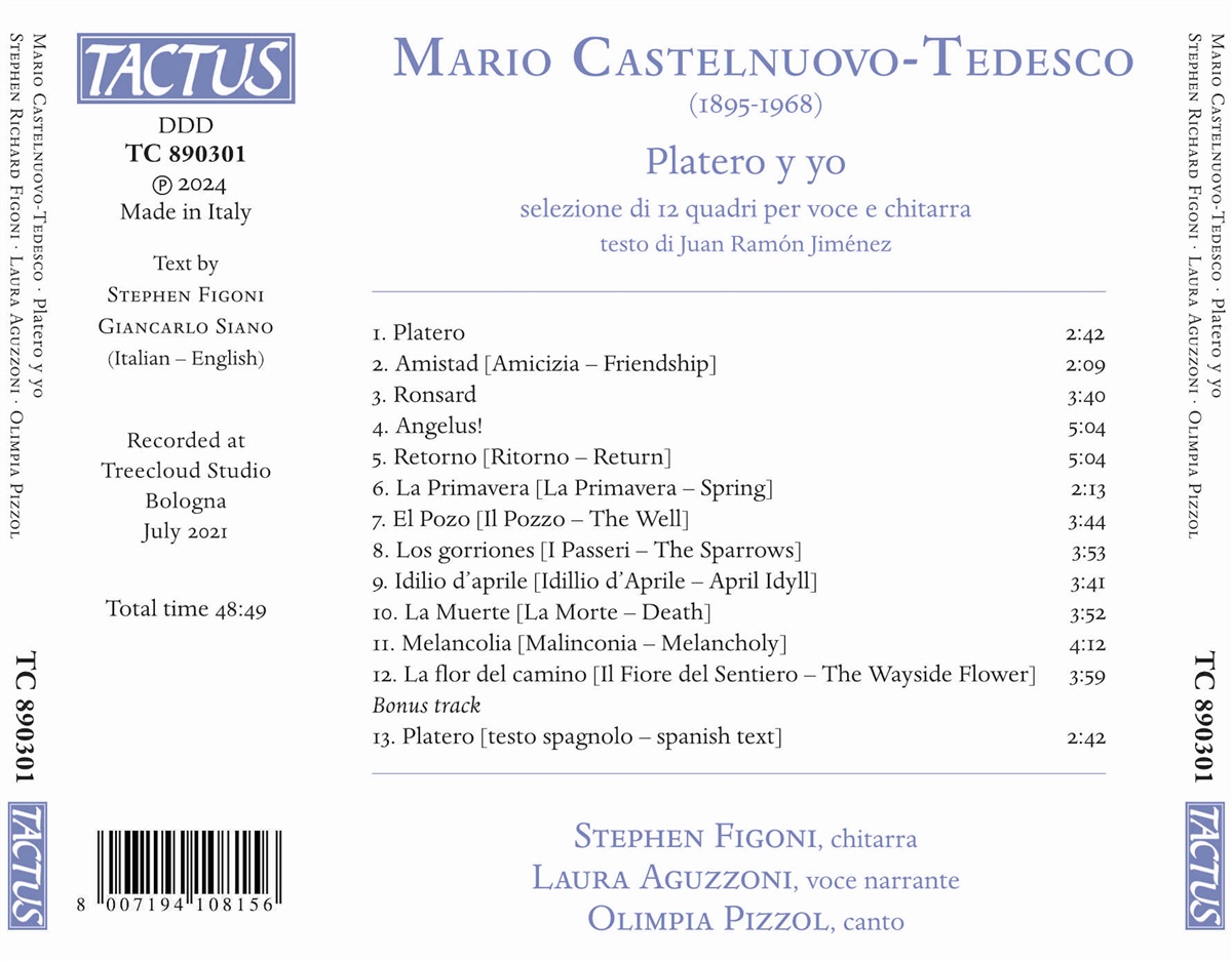Juan Ramón Jiménez ist der Autor der berühmten poetischen Prosa in 138 kurzen Episoden, „Platero y yo“, die er 1914 schrieb. Als Verfechter der Einfachheit des Lebens und sensibler Dichter erzählt er eine Geschichte, die von einem klassischen Sinn für Form und gleichzeitig von ‚Moral‘ durchdrungen ist, von der Rückkehr des Protagonisten in das Land seiner Kindheit und von seiner Begegnung mit dem Esel Platero. Die Bilder, die der Dichter uns durch die Augen des jungen Esels zeigt, sind die einer typisch spanischen Landschaft mit Szenen eines unberührten und reinen Lebens. Das märchenhafte Abenteuer dieser Seiten voller reiner Poesie, Liebe und Nostalgie lässt niemanden unberührt. Der Leser, der der Erzählung folgt, findet sich am Ende mit dem Blick eines Kindes voller Staunen wieder und überwältigt von dieser magischen Reise. Mario Castelnuovo-Tedesco erkannte den Wert dieses Werkes und beschloss, einige der Szenen zu vertonen, nicht für Gitarre und Gesangsstimme (hauptsächlich), sondern für Gitarre und Erzähler. Nach der Lektüre der literarischen Stücke ist es offensichtlich, dass die Kriterien für seine Auswahl der ästhetische Inhalt und die offensichtliche ‚Übersetzbarkeit‘ des Inhalts in eine rein musikalische Sprache waren. Der Gitarrist Stephen Figoni und die Stimmen von Laura Aguzzoni und Olimpia Pizzol entführen uns in eine einfache, verzauberte Welt.