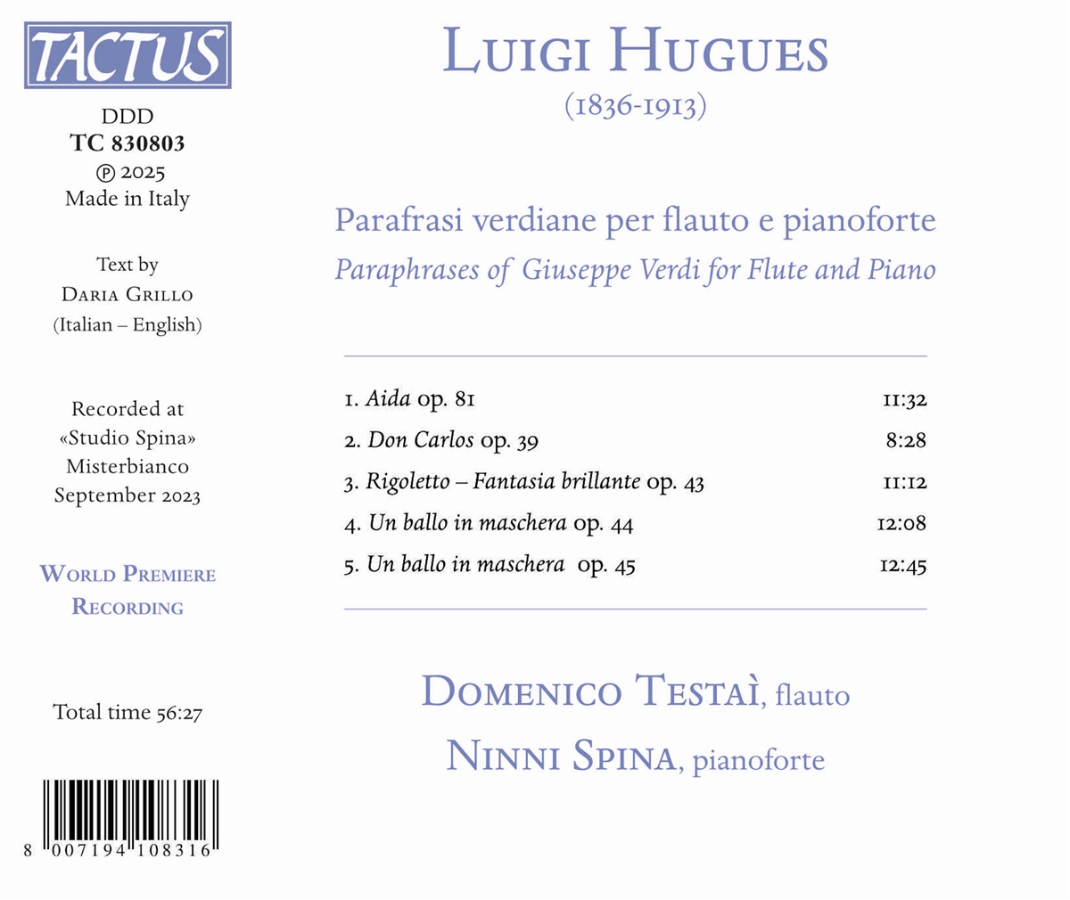 Luigi Hugues war nicht nur Ingenieur, Mathematiker und Professor für Geographie, sondern auch Flötist, Komponist und ein angesehener Vertreter des Musikgenres „Salonmusik“ des 19. Jahrhunderts – Stücke, die für den täglichen Gebrauch geeignet waren und von einem breiten Publikum geschätzt werden konnten, aber gleichzeitig unverkennbar didaktische Züge aufwiesen. Eine sorgfältige Analyse seiner Musik zeigt darüber hinaus einen bewussten, absichtlichen Einsatz des virtuosen Stils, der im 19. Jahrhundert in Mode war und vom Konzertpublikum sehr geschätzt wurde: Dieses Merkmal ist besonders deutlich in allen Variationen über Opernthemen für eine oder zwei Flöten und Klavierbegleitung zu erkennen.