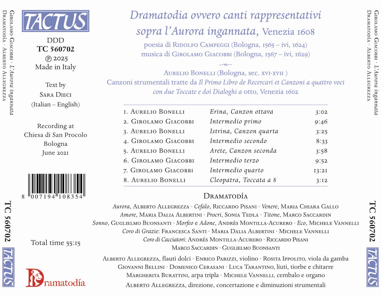 Im frühen 17. Jahrhundert herrschte in Bologna eine großartige kulturelle Vitalität, und es ist immer wieder faszinierend, die Verbindungen zwischen akademischen Unternehmungen und dem täglichen Leben, zwischen den regelmäßig stattfindenden Festlichkeiten und den städtischen Institutionen zu erfassen. Aus dieser reichen Ideenschmiede sollten sich zwei Jahrhunderte des Glanzes und herausragender Talente entfalten, die in allen Bereichen des Wissens und der Künste aktiv waren. Die Aufführung der Tragikomödie „Filarmindo“ von Ridolfo Campeggi, die 1605 zur Feier der Hochzeit des Marquis Ferdinando Riario und der Gräfin Laura Pepoli stattfand, war – gemäß einer bewährten Theaterpraxis – mit den vier Intermezzi von „Aurora Ingannata“ ‚aufgefüllt‘. Die Aufgabe, die Musik für diese Intermezzi zu komponieren, wurde Girolamo Giacobbi übertragen, der zu dieser Zeit Kapellmeister der Basilika San Petronio und ein hoch angesehener Fachmann war. Diese denkwürdige Aufführung, die in den Chroniken der damaligen Zeit festgehalten wurde, wird vom Ensemble Dramatodía (bereits in „Il Festino del Giovedì Grasso“ von Adriano Banchieri zu hören) meisterhaft wiederbelebt und ist eine Hommage an das Juwel, nach dem sich das Ensemble benannt hat.