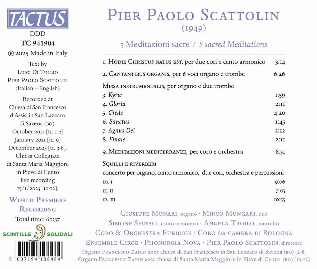 Pier Paolo Scattolins eklektischer Kompositionsstil, der sich parallel zu seiner intensiven Tätigkeit als Chorleiter entwickelte, erreicht mit dieser diskografischen Produktion einen wichtigen Meilenstein. Im Gegensatz zu seinem letzten Album „Suoni e rime sparse“, das 2021 veröffentlicht wurde und sich auf profane poetische Inspiration konzentrierte, steht dieses Album ganz im Zeichen sakraler und spiritueller Themen. Tatsächlich bilden ausschließlich sakrale Themen (sowohl historische als auch eigene) das Rückgrat dieser fünf Meditationen, in denen eine große Vielfalt an Instrumenten und Ensembles zum Einsatz kommt, darunter auch klangliche Besonderheiten, die durch harmonischen Gesang und tibetische Glocken erzeugt werden. Der Euridice-Chor aus Bologna in seinen verschiedenen Besetzungen ist erneut Protagonist der Gesangsparts, flankiert vom Circe-Ensemble und außergewöhnlichen Solisten, denen der Autor die Uraufführungen sowohl auf Tonträger als auch im Konzert widmet.