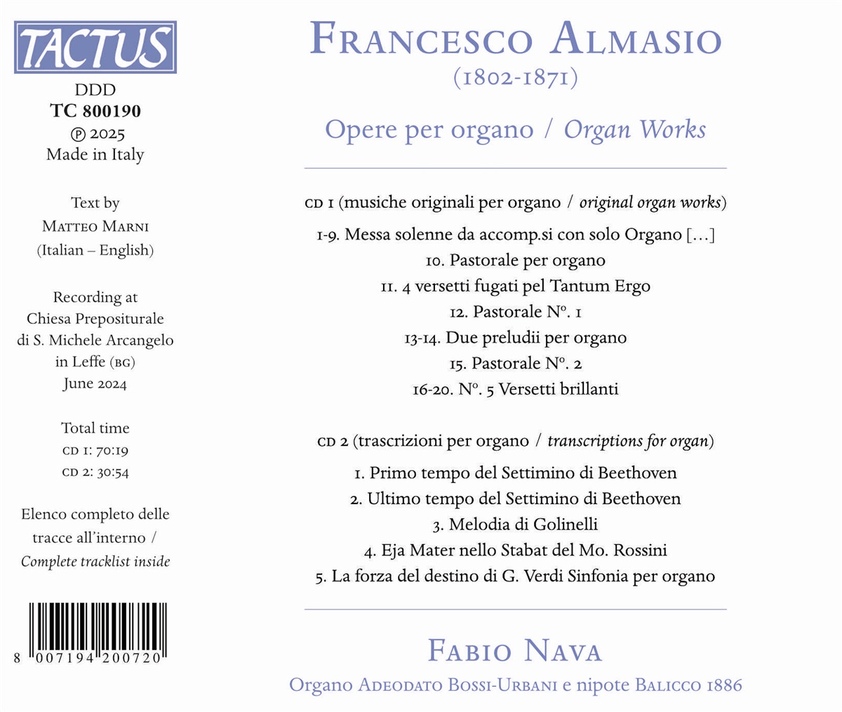 Der Organist Fabio Nava verwendet die historische Bossi-Urbani-Orgel aus dem Jahr 1886 in der Prepositurale-Kirche von Leffe, um diese Aufnahme der Orgelwerke von Francesco Almasio bestmöglich wiederzugeben. Neben den Originalkompositionen sind vor allem die Orgeltranskriptionen des Mailänder Komponisten interessant. Neben berühmten Stücken wie Eja Mater aus Rossinis „Stabat Mater” und der Sinfonia aus Giuseppe Verdis „La Forza del Destino” bearbeitete er zwei Sätze aus Beethovens Septett für Orgel und bereicherte damit das sakrale und liturgische Repertoire seiner Zeit um das Genre der Kammermusik.