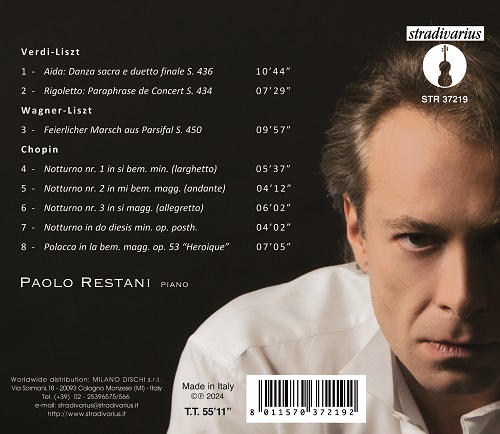 Paolo Restanis neue Einspielung ist das Ergebnis einer konstanten und sehr persönlichen Forschungsarbeit die den Hörer durch verschiedene Bereiche der Klavierliteratur führt. Das Album beginnt mit zwei Paraphrasen von Liszt. Die erste aus Verdis ‚Aida‘, „Danza sacra e duetto finale“, die zweite aus ‚Rigoletto‘, „Paraphrase de Concert“, die sich auf das wunderbare Quartett des vierten Aktes konzentriert, in dem die verschiedenen Stimmungen der Protagonisten ineinandergreifen. Von der Welt Verdis geht es weiter zu Wagner mit dem „Feierlichen Marsch zum Heiligen Gral“ aus dem ersten Akt des ‚Parsifal‘. Diese Reise in die Dynamik eines faszinierenden Universums von Bezügen und Beziehungen endet mit der Aufführung von vier Nocturnes von Chopin.
