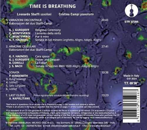 Die neue CD „Time is breathing“ des Duos Sbaffi Campi, mit Leonardo Sbaffi am Saxophon und Cristina Campi am Klavier, ist eine persönliche musikalische Reise zwischen Gegenwart und Vergangenheit. Mit einer freien und leidenschaftlichen Herangehensweise der beiden Musiker entwickelt sich eine Hörreise, die durch Kontamination gekennzeichnet ist, im Gefolge von musikalischen Lösungen, die Horizonte erweitern und Geschichten, Bilder und Emotionen umreißen, in einer eklektischen Begegnung zwischen dem klassischen und zeitgenössischen Repertoire.