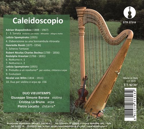 Dieses Projekt ist das Ergebnis musikalischer Forschungen in verschiedenen Bereichen. Es umfasst Originalwerke für Harfe und Violine in einer Vielzahl von Kompositionsstilen. Die Auswahl verschiedener historischer Epochen zielt darauf ab, den Schwerpunkt auf selten gespielte Stücke oder, im Falle zeitgenössischer Werke, auf Weltpremieren zu legen. Die verwendeten Klangwelten, die vom 19. Jahrhundert bis zur Gegenwart reichen, sollen das technische, instrumentale und musikalische Potenzial des Duo Vieuxtemps hervorheben. Das Ziel der Arbeit des Duos ist es, den Zuhörer auf eine musikalische Reise mitzunehmen, eine Klangreise, die ein Kaleidoskop von Empfindungen, Formen und Farben bietet, mit der Absicht, die Wahrnehmung des Vergehens der Zeit anzuhalten und sich vom Klang mitreißen zu lassen. Vertreten sind Kompositionen von Adrian Shaposhnikov, Letizia Spampinato, Henriette Reniè, Robert Nicolas Charles Bochsa, Rodolphe Kreutzer, Letizia Spampinato und Nicolai von Wilm. Duo Vieuxtemps sind Violinist Giuseppe Simone Barone und Harfenistin Cristina La Bruna.