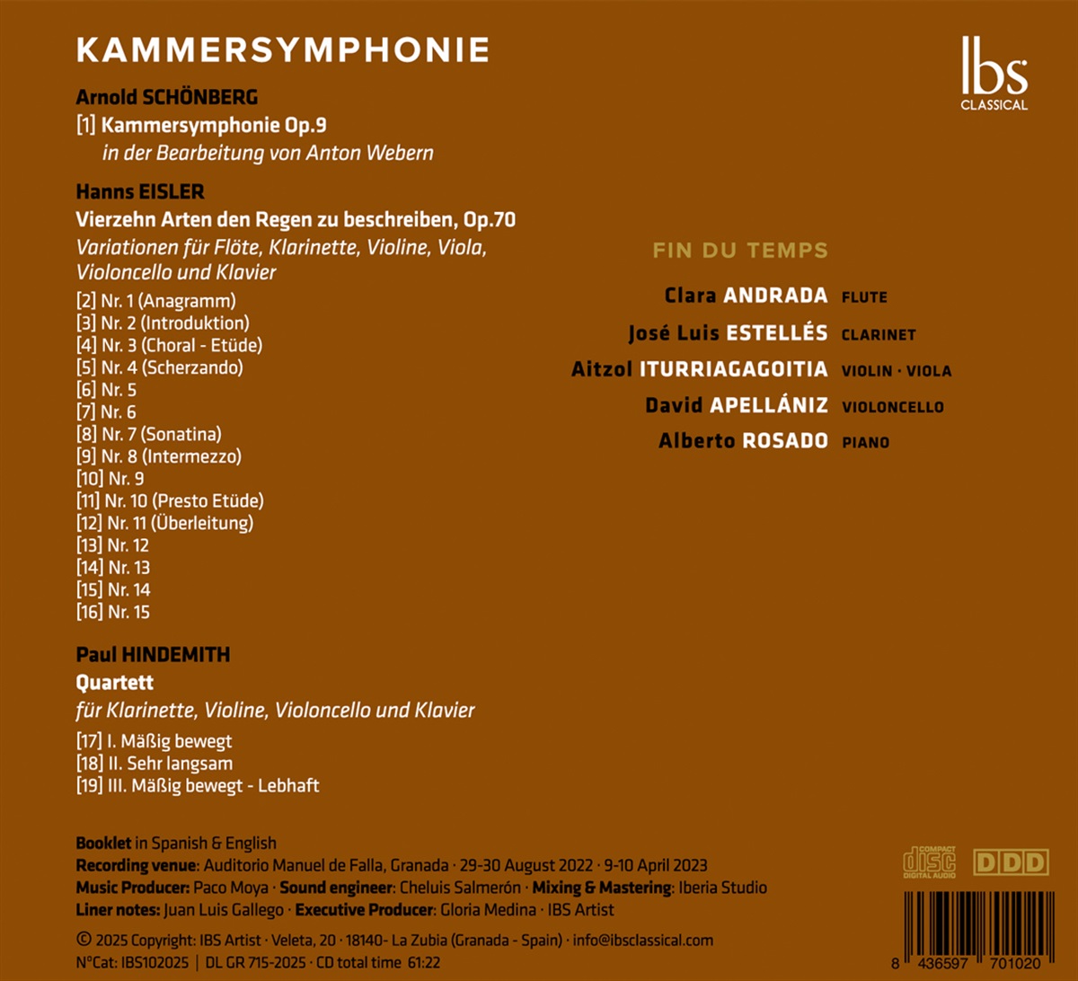 Nach dem Erfolg ihres ersten Albums präsentiert Fin Du Temps drei der bedeutendsten Werke der Kammermusikliteratur des 20. Jahrhunderts. Fin du Temps ist ein Projekt, das das moderne Konzept eines Solistenensembles aufgreift und Musiker zusammenbringt, die sowohl als Solisten als auch im Bereich der Kammermusik eine herausragende Karriere vorweisen können. Die Mitglieder des Ensembles schlossen sich erstmals im September 2017 zusammen, um eines der bedeutendsten Werke des 20. Jahrhunderts aufzuführen: „Quatuor pour la fin du Temps“ von Olivier Messiaen. Die Aufführung fand in der majestätischen Kathedrale von León statt und hinterließ sowohl beim Publikum als auch bei den Musikern selbst einen tiefen Eindruck. Dieses Konzert war der Beginn eines gemeinsamen Projekts, das seitdem kontinuierlich gewachsen ist. Auf dem vorliegenden Album spielt das Ensemble Arnold Schönbergs „Kammersymphonie“ sowie Hanns Eislers „Vierzehn Arten den Regen zu beschreiben“ und Paul Hindemiths Quartett für Klarinette, Violine, Violoncello und Klavier.