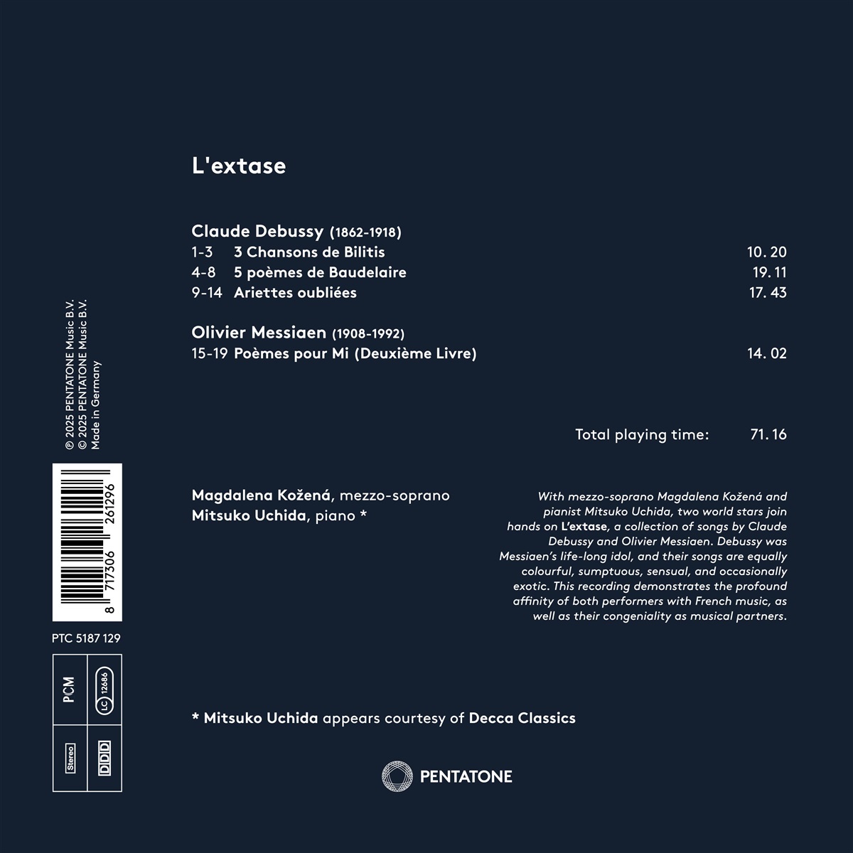 Mit der Mezzosopranistin Magdalena Kožená und der Pianistin Mitsuko Uchida geben sich zwei Weltstars die Hand für „L'extase“, einer Sammlung von Liedern von Claude Debussy und Olivier Messiaen. Debussy war Messiaens lebenslanges Idol, und ihre Lieder sind gleichermaßen farbenfroh, üppig, sinnlich und gelegentlich exotisch. Der Name des Albums leitet sich von dem schwülen Lied „C'est l'extase langoureuse“ aus Debussys „Ariettes oubliées“ ab, und dieser Liederzyklus ist mit seinen „Chansons de Bilitis“ und „Cinq poèmes“ auf Gedichte Baudelaires kombiniert, während Messiaen mit dem zweiten Buch seiner Poèmes pour Mi vertreten ist, einer Liebeserklärung an seine erste Frau Claire Delbos. Diese Einspielung zeigt die tiefe Verbundenheit der beiden Interpretinnen mit der französischen Musik und ihre Kongenialität als musikalische Partnerinnen.