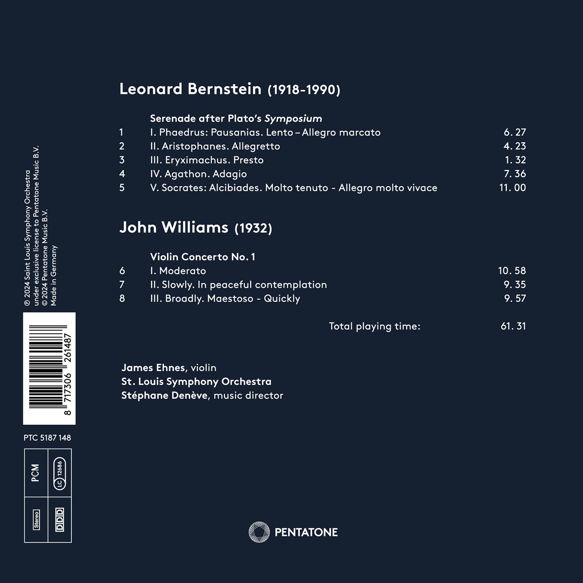 Das St. Louis Symphony Orchestra und ihr Musikdirektor Stéphane Denève präsentieren ein Programm mit zwei herausragenden US-amerikanischen Komponisten: Leonard Bernstein mit seiner „Serenade“ und John Williams mit seinem ersten Konzert für Violine und Orchester. John Williams hat es sich nicht nehmen lassen, bei der Einspielung seines Violinkonzertes dabei zu sein. Der Grund ist evident: Die Sologeige spielt James Ehnes, einer der herausragendsten Violinisten Nordamerikas. Beide Kompositionen beschäftigen sich mit der Liebe: Williams Konzert wurde vom plötzlichen Tod seiner Frau beeinflusst, während sich Bernstein von Platos Überlegungen über die Liebe inspirieren ließ.