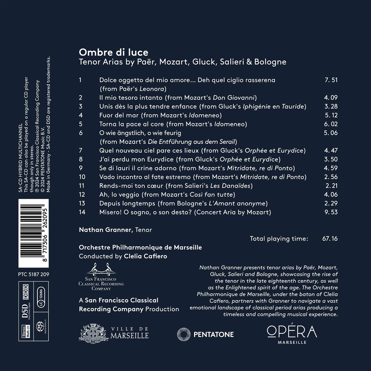 Nathan Granner präsentiert Tenorarien von Ferdinando Paër, Wolfgang Amadeus Mozart, Christoph Willibald Gluck, Antonio Salieri und Joseph Bologne und zeigt den Aufstieg des Tenor-Fachs im späten 18. Jahrhundert sowie den aufgeklärten Geist dieser Zeit. Das Orchestre Philharmonique de Marseille unter der Leitung von Clelia Caffiero begleitet Granner bei der Erkundung einer weiten emotionalen Landschaft von Arien aus der Klassik und schafft so ein zeitloses und fesselndes Musikerlebnis. Der Tenor Nathan Granner kann auf eine einzigartige und vielfältige Karriere zurückblicken, die es ihm ermöglicht, sein Timbre aus dem Goldenen Zeitalter in vielen Projekten und Produktionen einzusetzen. Er kehrt zu Pentatone zurück, nachdem er die Titelrolle in einer Highlights-Aufnahme von Gordon Gettys Oper „Goodbye, Mr. Chips“ (2022) gesungen hat, von der eine vollständige Aufnahme mit Granner in derselben Rolle 2025 erscheinen wird. Das Orchestre Philharmonique de Marseille ist bereits mehrfach bei Pentatone in Erscheinung getreten, u. a. auf Alben mit Martinůs Doppelkonzerten mit den Schwestern Kodama/Nemtanu sowie auf Recitals von Lisa Delan und Kevin Short (alle 2018). Clelia Caffiero gibt ihr Pentatone-Debüt.