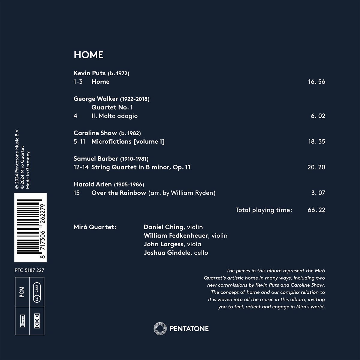 Das Miró Quartet präsentiert mit „Home“ ein neues Album, das sich mit den vielfältigen Bedeutungen des Wortes ‚Heimat‘ auseinandersetzt. Daneben repräsentiert das Album auch die Vereinigten Staaten, da die Stücke allesamt von amerikanischen Komponisten stammen. Das Album lädt also auch dazu ein, der künstlerischen Heimat der Mirós, respektive die Welt des Ensembles zu entdecken. Das Programm umfasst zwei neue Auftragswerke von Kevin Puts und Caroline Shaw, es enthält das Streichquartett op. 11 von Samuel Barber (mit der Originalfassung des „Adagio for Strings“), ein wenig bekanntes Werk von George Walker und als i-Tüpfelchen: ein Arrangement des Zauberer-von-Oz-Klassikers „Over the Rainbow“.