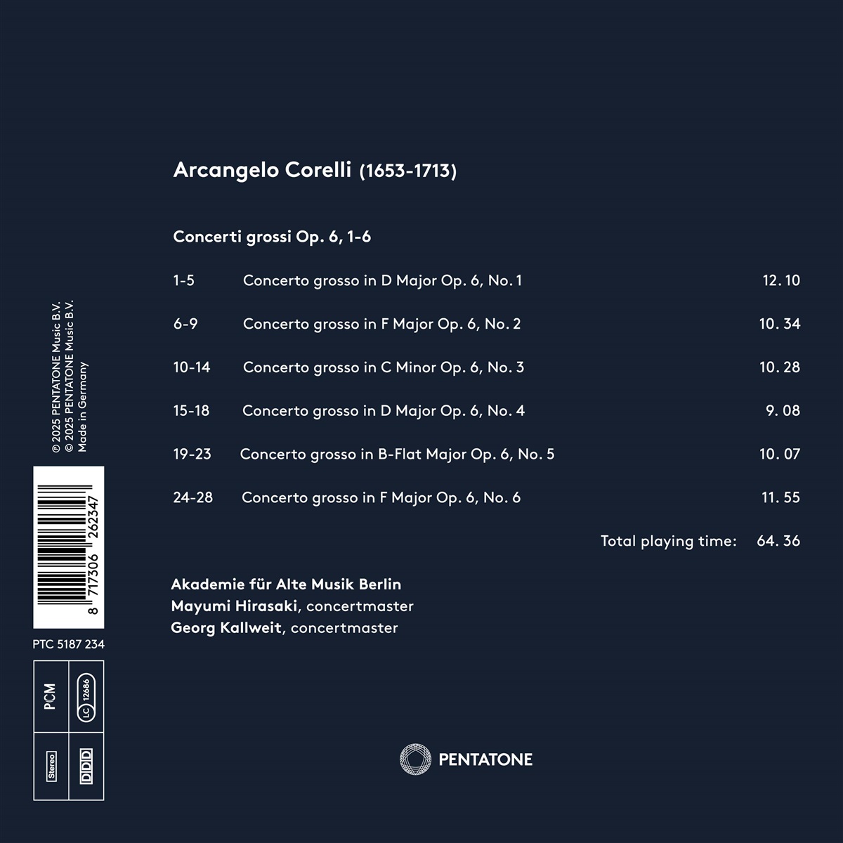 Nach der vollständigen Einspielung von Händels „Concerti grossi“ präsentiert die Akademie für Alte Musik Berlin nun eine Aufnahme der ersten sechs Concerti grossi op. 6 des Komponisten, Ensembleleiters und Violinenvirtuosen Arcangelo Corelli, der zu Lebzeiten fast kultartige Verehrung genoss. Der Komponist hatte seit den späten 1670er Jahren mit einer der markantesten Formen der Instrumentalmusik des Barock experimentiert, doch erst gegen Ende seines Lebens strebte er die Veröffentlichung dieser Kompositionen an und wählte aus einem vermutlich viel größeren Bestand zwölf exemplarische Stücke aus. Damit legte er den Grundstein für diese Instrumentalform für spätere Komponisten wie den bereits erwähnten Georg Friedrich Händel, der dem italienischen Barockmeister mit seinen beiden Werk-Zyklen Tribut zollte. Die Akademie für Alte Musik Berlin und ihre beiden Konzertmeister Mayumi Hirasaki und Georg Kallweit, stellen hier erneut ihre außergewöhnliche Virtuosität unter Beweis stellen. Das Ensemble verfügt über eine umfangreiche Diskografie, darunter die mit dem Diapason d'Or ausgezeichnete „Cantata“ mit Bejun Mehta.
