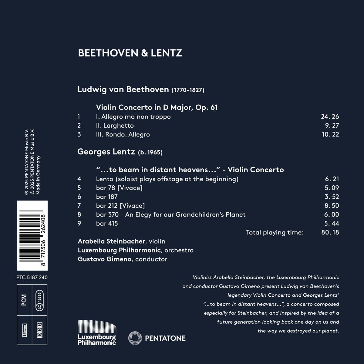 Die Geigerin Arabella Steinbacher, das Philharmonische Orchester Luxemburg und der Dirigent Gustavo Gimeno präsentieren Violinkonzerte von Ludwig van Beethoven und Georges Lentz. Beethovens Violinkonzert ist vielleicht einer der bekanntesten Beiträge zu diesem Genre, und für Steinbacher ist es das „heiligste“ und erhabenste im Repertoire, das immer wieder neue Perspektiven eröffnet. Das Stück wird zusammen mit dem Violinkonzert „...to beam in distant heavens...“ von Georges Lentz aufgeführt, das für Steinbacher geschrieben und von ihrer Virtuosität inspiriert wurde. Lentz' Konzert ist gleichermaßen von William Blakes Gedichten inspiriert wie von der Vorstellung, dass eine zukünftige Generation eines Tages auf uns und die Art und Weise, wie wir unseren Planeten zerstören, zurückblicken wird. Es schwankt zwischen Gewalt und himmlischen Visionen von Liebe und Hoffnung. Es stellt hohe Anforderungen an seine Solistin und bietet ein erhellendes Gegenstück zu Beethovens ebenso suchendem wie idealistischem Werk. Das Philharmonische Orchester Luxemburg und Gustavo Gimeno sind die idealen Partner für diese ebenso kosmische wie kühne Zusammenstellung.