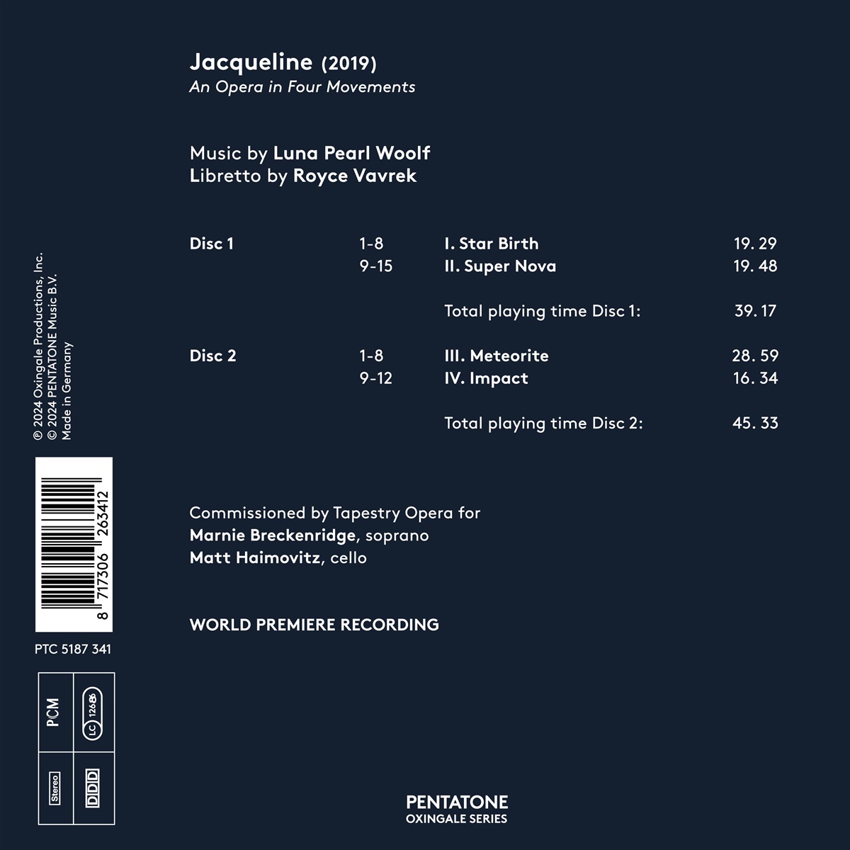 „Jacqueline“ ist eine kraftvolle, preisgekrönte neue Oper, die sich mit dem realen Kampf der berühmten Cellistin Jacqueline du Pré gegen Multiple Sklerose befasst, eine Krankheit, die ihren Körper, ihren Geist und ihr Talent zerstörte und sie ihrer Identität, ihrer atemberaubenden musikalischen Begabung und schließlich ihres Lebens beraubte. Darsteller der Geschichte sind die gefeierte amerikanische Sopranistin Marnie Breckenridge (Jacqueline) und der ehemalige Schützling von Jacqueline du Pré und weltberühmte Cellist Matt Haimovitz, der die Rolle ihres ständigen Begleiters spielt: ihr Cello. Die für einen Grammy nominierte Komponistin Luna Pearl Woolf und der mit dem Pulitzer-Preis ausgezeichnete Librettist Royce Vavrek zeichnen die Entwicklung des großen Wunderkinds und schließlich die große Tragödie nach. Die Oper ist in vier Sätzen erzählt – I. Star Birth; II. Super Nova; III. Meteorite; IV. Impact – und bezieht sich auf Haimovitz' persönliche Erinnerungen an du Pré selbst. Farbenfroh und manchmal witzig, rau, freudig und kühn, spiegelt die Form des Werkes du Prés ikonische Interpretation von Edward Elgars Cellokonzert wider, wobei die viersätzige Struktur des Konzerts genutzt wird, um durch ein facettenreiches und leidenschaftliches, wenn auch allzu kurzes Leben in der Musik zu navigieren.