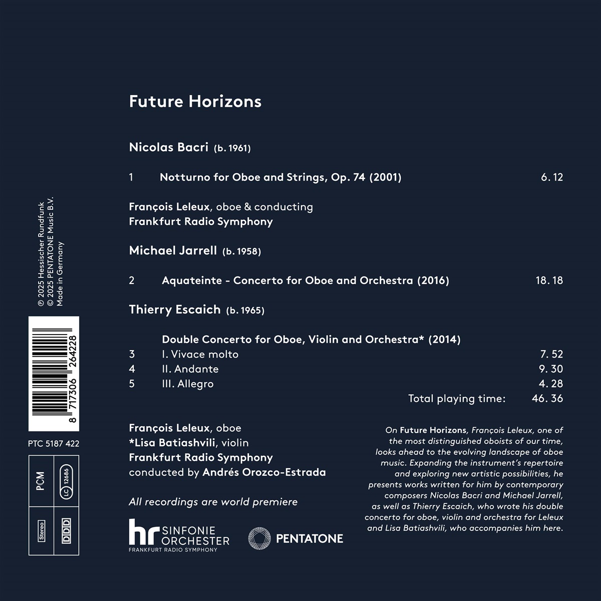 Auf „Future Horizons“ präsentiert François Leleux, einer der bedeutendsten Oboisten unserer Zeit, eine Sammlung von Werken für Oboe der renommierten Komponisten Nicolas Bacri, Michael Jarrell und Thierry Escaich, die das Repertoire des Instruments um neue künstlerische Möglichkeiten erweitern. Der Titel des Albums „Future Horizons“ spiegelt Leleux' Engagement wider, die Grenzen der klassischen Musik durch zeitgenössische Werke zu erweitern. In Bacris Notturno übernimmt Leleux sowohl die Rolle des Solisten als auch die des Dirigenten und leitet das Radio-Sinfonieorchester Frankfurt. In Jarrells Aquateinte und Escaichs Doppelkonzert für Oboe, Violine und Orchester, in dem auch die Geigenvirtuosin Lisa Batiashvili zu hören ist, steht ihm das Orchester unter der Leitung von Andrés Orozco-Estrada zur Seite. Jedes Werk auf diesem Album ist eine Weltersteinspielung, wobei alle Stücke speziell für diese Künstler geschrieben wurden. Andrés Orozco-Estrada kann zusammen mit dem Radio-Sinfonieorchester Frankfurt auf eine umfangreiche Diskografie bei PENTATONE verweisen, während François Leleux und Lisa Batiashvili ihr Label-Debüt geben.
