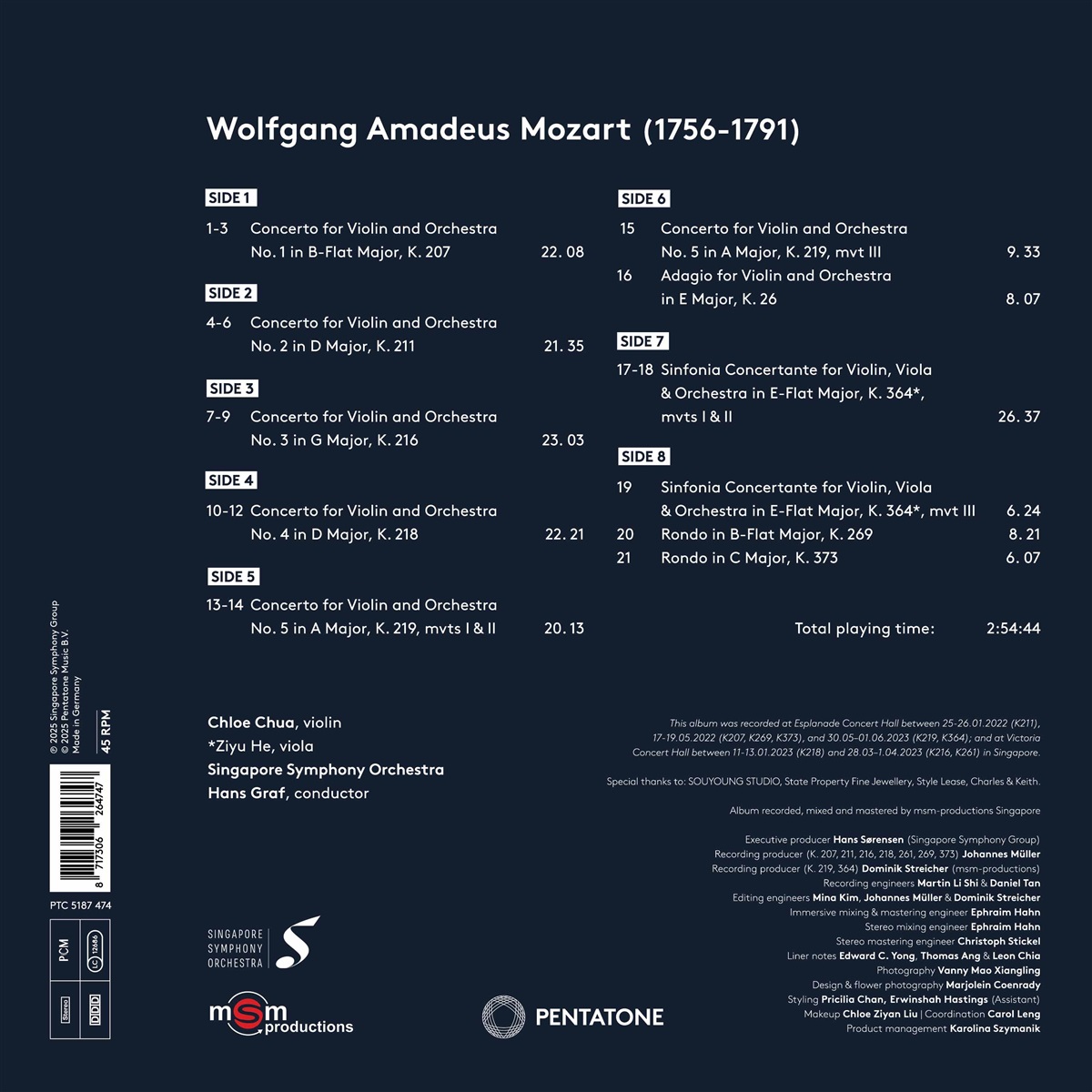 Das Album enthält neben den Violinkonzerten auch Mozarts Rondo in B-Dur, KV 269 und Rondo in C-Dur, KV 373, sowie die Sinfonia Concertante für Violine, Viola und Orchester in Es-Dur, KV 364. Bei letzterem tritt auch der herausragende junge chinesische Bratschist Ziyu He auf, der 2016 mit nur 16 Jahren den Yehudi-Menuhin-Wettbewerb gewonnen hat. In dieser Aufführung zeigt er sein bemerkenswertes Können an der Seite von Chloe, die selbst eine ehemalige Gewinnerin desselben prestigeträchtigen Wettbewerbs ist. Begleitet werden die Solisten vom Singapore Symphony Orchestra unter der Leitung von Hans Graf, der Chloe Chua seit vielen Jahren künstlerisch gefördert hat.