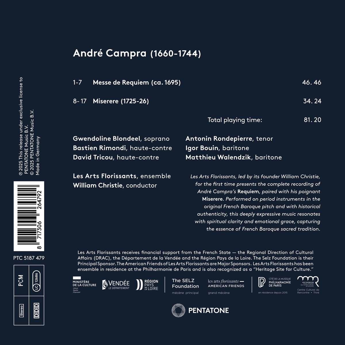 Les Arts Florissants, eines der renommiertesten Barockensembles der Welt, vereint sich mit seinem legendären Gründer und künstlerischen Leiter William Christie zu einer bahnbrechenden Veröffentlichung: der ersten vollständigen Aufnahme von André Campra's „Requiem“, gepaart mit seinem tief bewegenden „Miserere“. Diese Werke, voller Klarheit, Anmut und emotionaler Kraft, bieten ein zutiefst persönliches und spirituelles Hörerlebnis. Campra spricht mit seiner Musik direkt die Seele an, mit subtilen, ausdrucksstarken und zeitlosen Harmonien. Auf historischen Instrumenten in der originalen französischen Stimmung und von einem authentischen Ensemble eingespielt, ist diese Aufnahme eine Meisterleistung historisch informierter Aufführungspraxis, die Campra und seiner Zeit treu bleibt und von Musikern auf dem Höhepunkt ihres Könnens lebendig umgesetzt wird. Mit ihrem unverkennbar reichen und nuancenreichen Klang verleiht Les Arts Florissants jeder Phrase die Eleganz des französischen Musikerbes, selbst in lateinischen Texten, die von der einzigartigen französischen Aussprache der damaligen Zeit geprägt sind. Dies ist mehr als eine Aufnahme, es ist die Wiederentdeckung einer der raffiniertesten Stimmen der geistlichen Musik. Das Barockmusik-Ensemble Les Arts Florissants wurde 1979 gegründet und besteht aus einem Instrumentalensemble und einem klein besetzten Vokalensemble. Es verfügt über eine beeindruckende Diskographie mit rund 100 Werken und ist eines der bekanntesten Ensembles der Welt.
