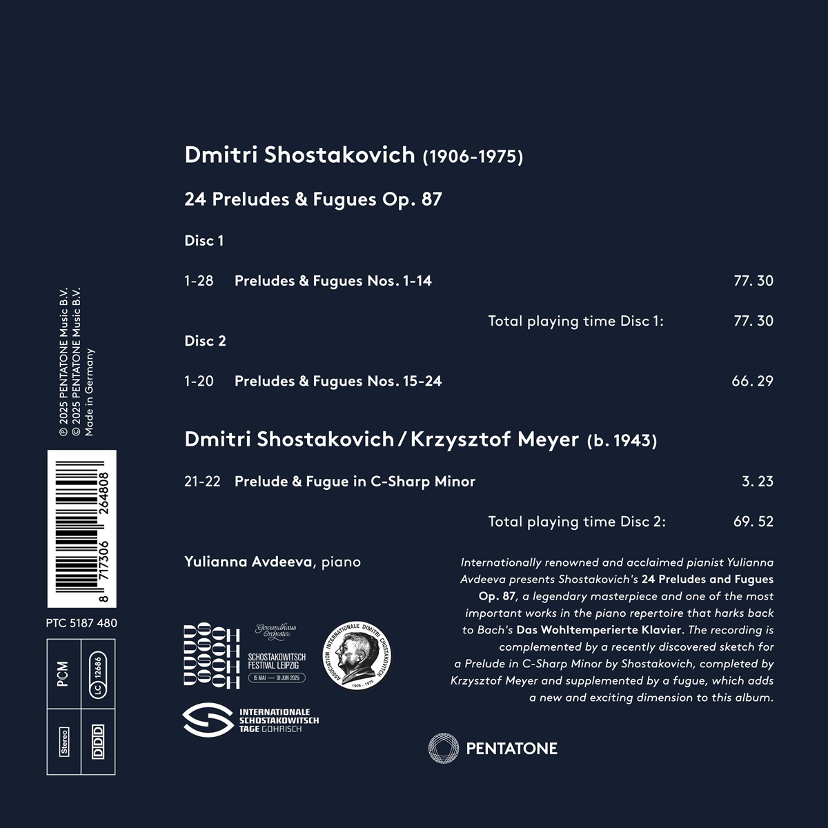 Die international renommierte Pianistin Yulianna Avdeeva präsentiert Schostakowitschs „24 Präludien und Fugen“ op. 87, eines der bedeutendsten Werke des Klavierrepertoires. Dieser monumentale Zyklus knüpft an Johann Sebastian Bachs „Wohltemperiertes Klavier“ an und gilt als eines der anspruchsvollsten Werke für Klavier, das je geschrieben wurde. Avdeeva reiht sich damit in eine elitäre Gruppe von Pianisten ein, die sich der Herausforderung gestellt haben, das gesamte Werk aufzuführen, das nur selten in seiner Gesamtheit zu hören ist. Als Ergänzung zu diesem ikonischen Werk stellt Avdeeva auch die Fertigstellung einer alternativen „Präludie und Fuge in cis-Moll“ vor, die von der führenden Schostakowitsch-Expertin Olga Digonskaya entdeckt und vom Komponisten und Schostakowitsch-Biografen Krzysztof Meyer vollendet wurde. Schostakowitsch skizzierte 1950 ein erstes Präludium in cis-Moll, entschied sich dann aber, ein neues Präludium-Fugen-Paar in dieser Tonart zu komponieren, das schließlich seinen Weg in Opus 87 fand. Die Skizze des ursprünglichen Präludiums wurde 2005 im Schostakowitsch-Archiv in Moskau gefunden; Krzysztof Meyer vollendete das Fragment 2019 und fügte eine eigene Fuge „im Stil Schostakowitschs“ hinzu. Diese Entdeckung verleiht dem Zyklus eine neue, spannende Dimension und wird ein wichtiger Teil der Geschichte hinter dem Album sein. Yulianna Avdeeva hat kürzlich die Alben „Resilience“ (2023) und „Chopin: Voyage“ (2024) veröffentlicht, die beide für ihre außergewöhnliche Kunstfertigkeit und Interpretation hervorragende Kritiken erhielten.