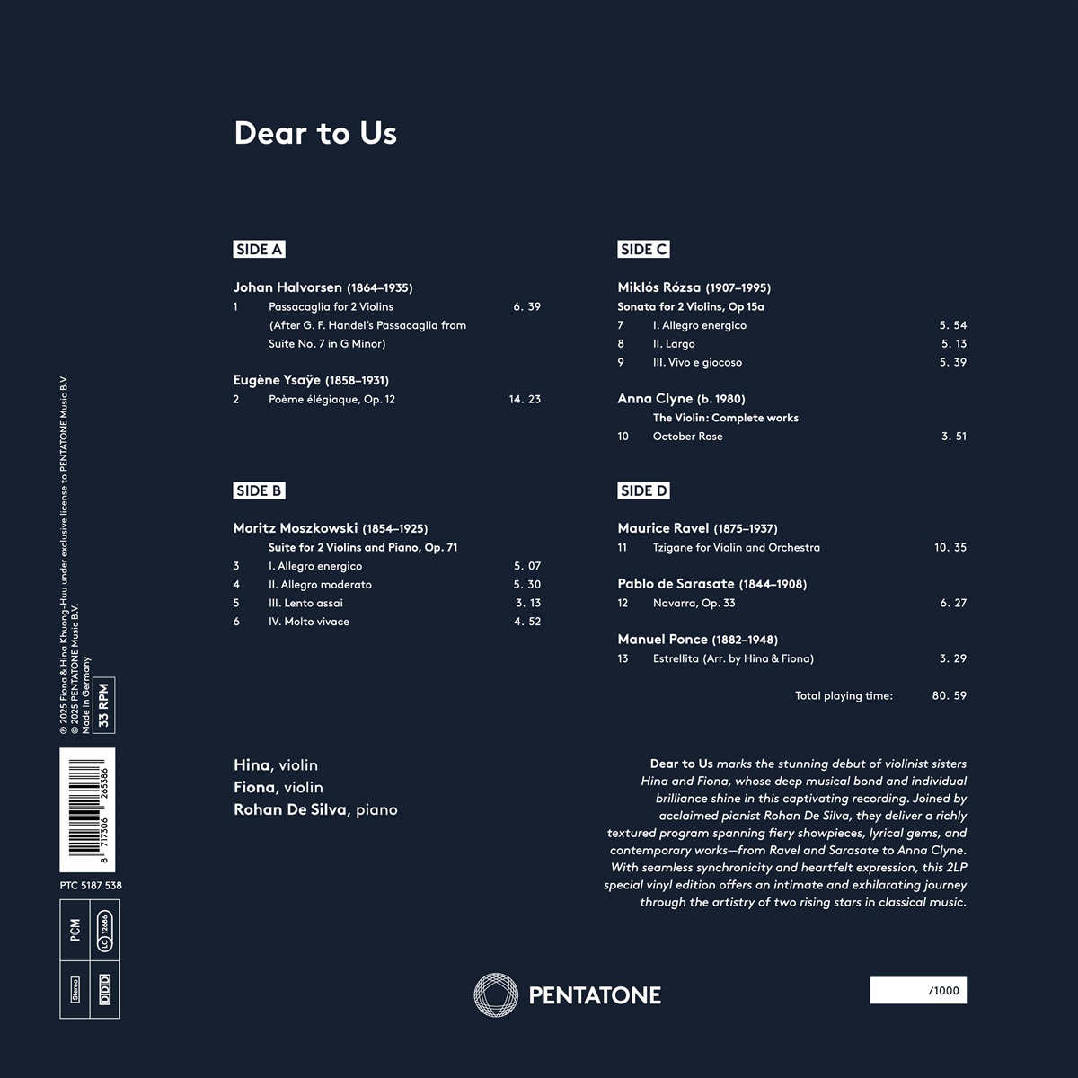 „Dear to Us“, das Debütalbum der Schwestern Hina & Fiona, fängt die seltene und wunderbare Verbindung zwischen zwei aufstrebenden Violinstinnen in der klassischen Musikwelt ein. Die begabten Schwestern wurden in New York als Töchter französisch-vietnamesischer und japanischer Eltern geboren und haben bereits einzeln bemerkenswerte Meilensteine erreicht: Hina gewann kürzlich den ersten Preis beim Internationalen Elmar-Oliveira-Violinwettbewerb 2023, während Fiona mit 16 Jahren ihr Debüt bei der New York Philharmonic gab. Beide starten eine glänzende Solokarriere. Ihr gemeinsames Spiel offenbart eine tiefe Verbundenheit, die durch lebenslange Zusammenarbeit, ehrlichen künstlerischen Dialog und sich ergänzende Interpretationen geprägt ist. Begleitet vom renommierten Pianisten Rohan De Silva präsentieren sie ein sorgfältig zusammengestelltes Programm, das beliebte Klassiker mit weniger bekannten Preziosen in Einklang bringt: Werke von Johan Halvorsen, Moritz Moszkowski, Eugène Ysaÿe, Miklós Rózsa und der zeitgenössischen Komponistin Anna Clyne sind vertreten. Von der feurigen Virtuosität von Maurice Ravels „Tzigane” und Pablo de Sarasates „Navarra” bis zur zarten Wärme von Manuel Ponces „Estrellita” ist „Dear to Us” eine fesselnde Reise durch technische Brillanz und tief empfundenen Ausdruck. Die außergewöhnliche Synchronizität der Schwestern, gepaart mit ihren unverwechselbaren Stimmen, schafft ein musikalisches Erlebnis, das sowohl intim als auch berauschend ist.