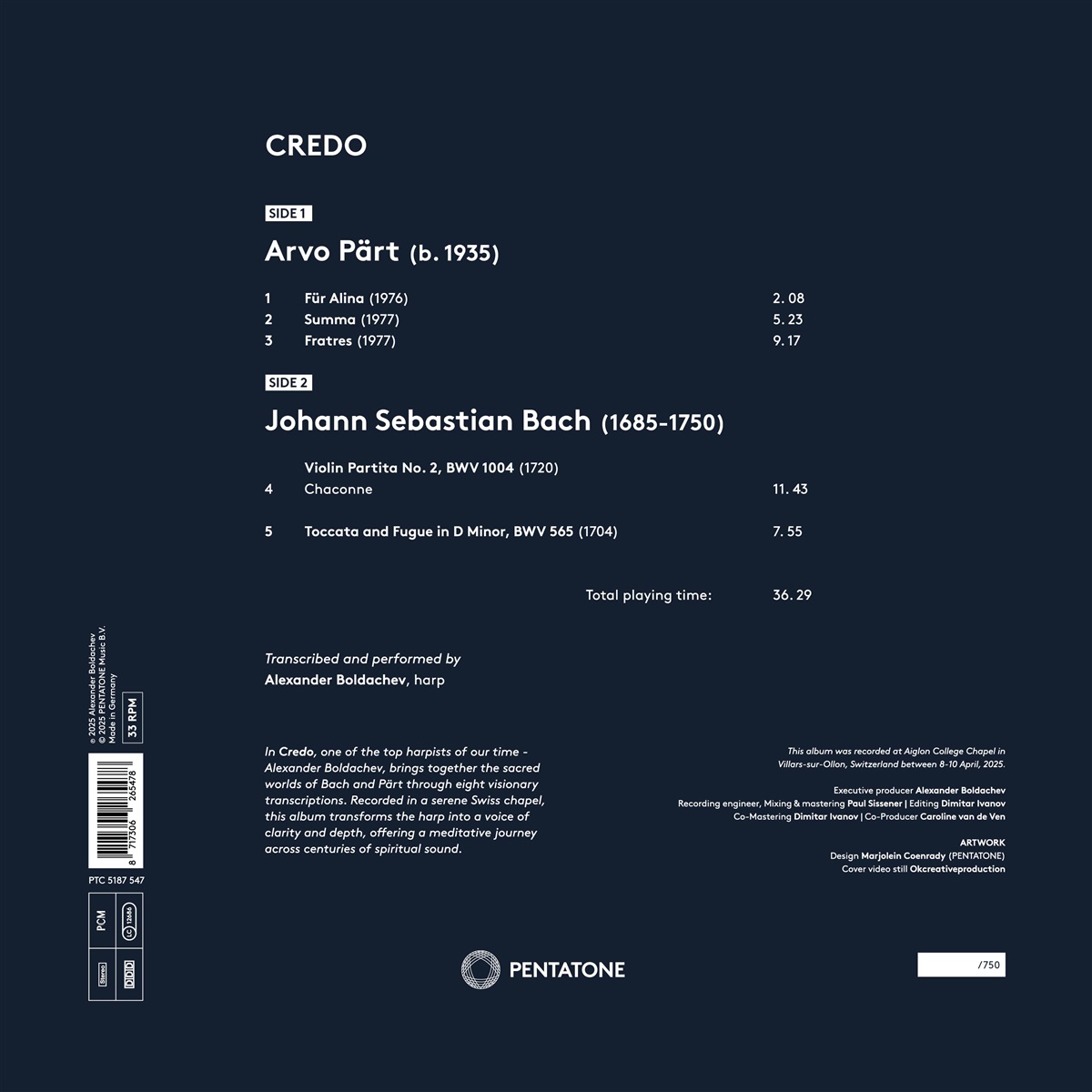 „Credo“, das Debüt-Soloalbum des Harfenvirtuosen Alexander Boldachev, ist jetzt auf Vinyl erhältlich. Die Aufnahme stellt eine Reise voller Strahlkraft durch die sakralen Klangwelten von Johann Sebastian Bach und Arvo Pärt dar. In acht visionären Transkriptionen für Solo-Harfe umfasst „Credo“ 250 Jahre geistlicher Musik – von Bachs komplexer Architektur bis zu Pärts kontemplativem Minimalismus. Boldachev interpretiert die Harfe neu als ein ausdrucksstarkes Instrument, das sowohl Erhabenheit als auch Intimität vermitteln kann. Aufgenommen in der beschaulichen Kapelle des Aiglon College in den Schweizer Alpen, bietet „Credo“ Zuflucht und Offenbarung zugleich. Das Album ist ein zutiefst persönliches musikalisches Statement und lädt die Zuhörer in einen kontemplativen Raum ein – ideal für Meditation, stille Konzentration oder einfach nur zum Da-Sein. Credo ist jetzt als wunderschön gestaltete 1LP-Vinyl-Edition erhältlich und bereichert das Hörerlebnis mit der Wärme und Intimität, die nur Vinyl bieten kann. Boldachev spielt diese Werke nicht nur – er verkörpert sie und stellt einen zeitlosen Zusammenhang zwischen zwei Komponisten her, die durch spirituelle Schwingungen miteinander verbunden sind. Alexander Boldachev ist ein klassischer Crossover-Harfenist, Komponist und Innovator. Er gründete das Zürcher Harfenfestival, initiierte den Welt-Harfen-Tag in Hongkong und ist Gastprofessor an der Royal Academy of Music und am Konservatorium von Mailand. In über drei Jahrzehnten auf der Bühne trat er in der Carnegie Hall auf, begleitete Robbie Williams bei der Eröffnungsfeier der FIFA-Weltmeisterschaft und spielte auf Festivals wie dem Burning Man und dem Verbier Festival in der Schweiz.