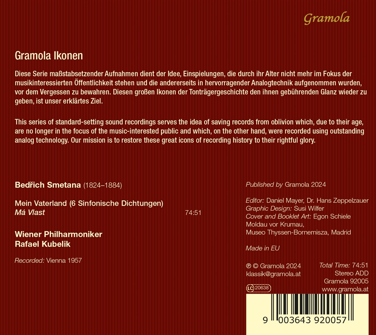 Die Serie ‚Gramola Ikonen‘ dient der Idee, Einspielungen, die durch ihr Alter nicht mehr im Fokus der musikinteressierten Öffentlichkeit stehen und die andererseits in hervorragender Analogtechnik aufgenommen wurden, vor dem Vergessen zu bewahren. Diesen großen Ikonen der Tonträgergeschichte den ihnen gebührenden Glanz wieder zu geben, ist das erklärtes Ziel dieser Reihe. Auf diesem Album sind die sechs sinfonischen Dichtungen “Ma Vlast” von Bedrich Smetana zu hören. Rafael Kubelik dirigiert die Wiener Philharmoniker.