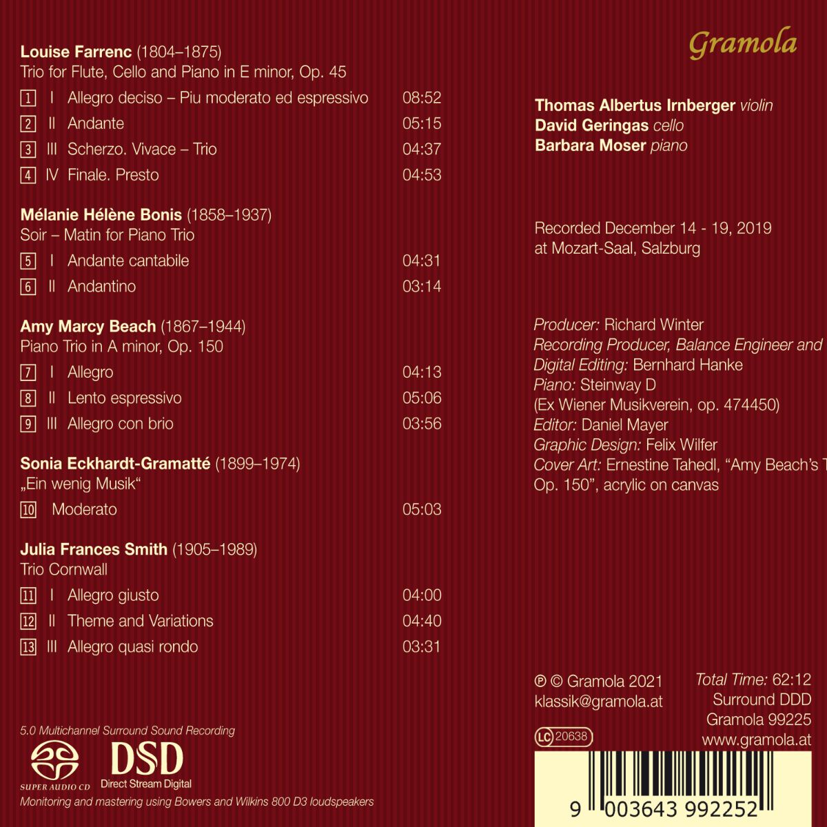 Amy Marcy Beach kombinierte 1938 in ihrem Trio kunstvoll die damalige französische Moderne mit der Spätromantik und amerikanischen Folklore-Elementen. Sonia Eckhardt-Gramattés Werk „Ein wenig Musik“ besticht durch Originalität, melodiöse Einfälle und vielfältige rhythmische Komponenten. Louise Farrencs Trio (von 1857) belegt, dass sie eine Zeitgenossin der frühen Romantik war, sich aber auch mit Alter Musik befasst hatte. Mélanie Hélène Bonis Stücke für Klaviertrio „Soir“ und „Matin“ entstanden 1907 und spiegeln die verschiedenen Stimmungen eines Tages wider. Julia Frances Smiths 1966 entstandenes Cornwall-Trio sprüht vor witziger, verspielter Energie einer begnadeten Komponistin, der das Können und musikgeschichtliche Wissen mit beeindruckender Leichtigkeit von der Hand gehen.
