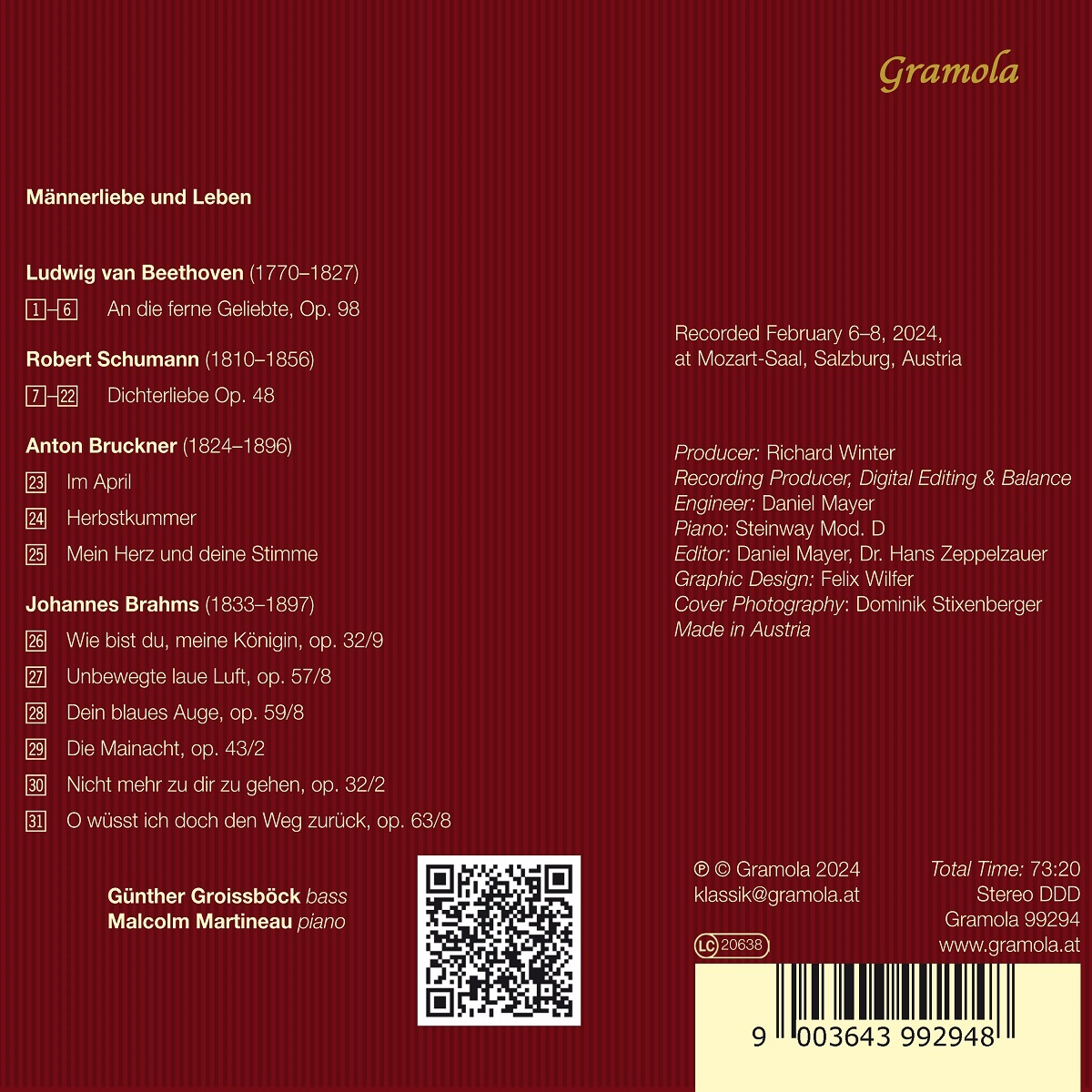 Nach dem erfolgreichen Album „Nicht Wiedersehen!“ widmen sich der weltweit reüssierende Bassist Günther Groissböck und einer der profiliertesten Pianisten seines Fachs, Malcolm Martineau, mit ihrem neuen Programm nun dem Sujet der Liebe. Unter dem Titel „Männerliebe und Leben“ gehen sie – in Anlehnung an Schumanns bekannten Zyklus „Frauenliebe und -leben“ – der Liebe aus Männersicht auf den Grund. Beginnend mit dem wohl ersten Liederzyklus der Musikgeschichte „An die ferne Geliebte“ von Ludwig van Beethoven, präsentiert das bestens eingespielte Duo im Weiteren Richard Schumanns „Dichterliebe“. Drei Lieder aus der Feder von Anton Bruckner („Im April“, „Herbstkummer“ und „Mein Herz und deine Stimme“) stehen weiteren ausgewählten Lieder von Johannes Brahms, u. a. „Wie bist du, meine Königin“, „ Unbewegte laue Luft“, „Die Mainacht“ oder „Nicht mehr zu dir zu gehen“, voran.