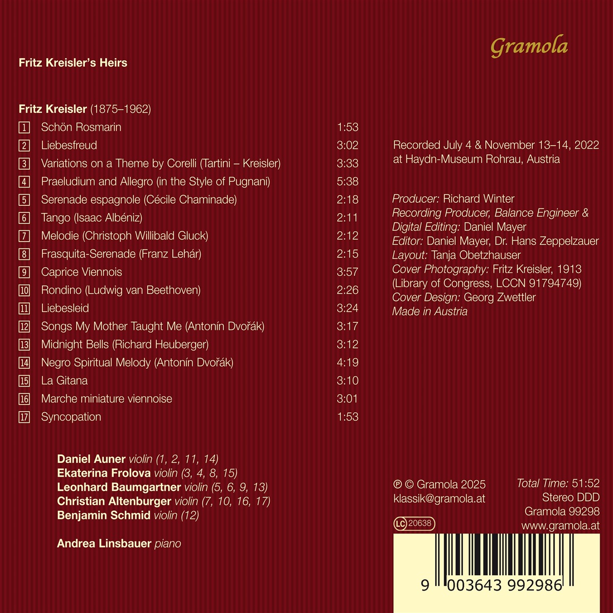 Es ist keine Übertreibung, Fritz Kreisler (1875–1962) als einen der zwei oder drei bedeutendsten österreichischen Geiger der Musikgeschichte zu bezeichnen. Auch Jahrzehnte nach seinem Tod ist sein Name für Musikliebhaber weltweit ein Maßstab geblieben. Die Wiener Pianistin Andrea Linsbauer, die sich seit langem mit dem Erbe Kreisler beschäftigt, präsentiert nun mit dem Album „Fritz Kreisler’s Heirs“ ein einzigartiges Projekt. Sie versammelt fünf der renommiertesten Violinvirtuosen Österreichs – Benjamin Schmid, Ekaterina Frolova, Leonhard Baumgartner, Christian Altenburger und Daniel Auner –, die ihre ganz persönlichen Interpretationen von Kreisler’s kleinen Meisterwerken präsentieren. Dass diese Künstler seit Jahren Andrea Linsbauers feste Duopartner sind, wird in jeder Note deutlich: Jede Darbietung ist geprägt von der Intimität eines gemeinsamen musikalischen Dialogs, der Kreisler's Sinn für Neuerfindung würdigt. Das Album enthält Evergreens von Kreisler wie „Liebesleid“, „Liebesfreud“, „Schön Rosmarin“, „Caprice Viennois“ oder „Syncopation“ sowie Kreisler-Arrangements von Stücken von Ludwig van Beethoven, William Bluck, Cécile Chaminade, Giuseppe Tartini, Antonín Dvořák und Richard Heuberger.