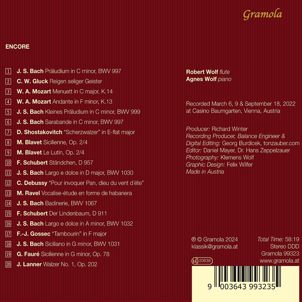 Einer der Höhepunkte des Konzertes mag für viele Zuhörerende die Zugabe sein. Das Duo Robert und Agnes Wolf hat sich diesen Preziosen gewidmet und eine Vielzahl dieser kleinen Werke von Joann Sebastian Bach, Wolfgang Amadeus Mozart, Michel Blavet, Franz Schubert und zahlreichen weiteren Komponisten für ihr Album „Encore‟ eingespielt.