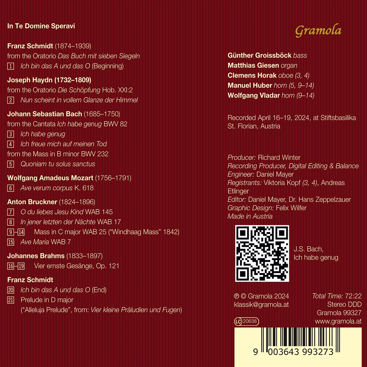 Diese Zusammenstellung der größten geistlichen Kompositionen für Bass und Orgel findet ihre idealen Interpreten im Sänger Günther Groissböck und Matthias Giesen auf der Brucknerorgel in St. Florian. Die Bandbreite reicht von Johann Sebastian Bach über Joseph Haydn und Wolfgang Amadeus Mozart zu Anton Bruckner und Johannes Brahms und endet mit dem Schluss des Oratoriums „Das Buch mit sieben Siegeln“ von Franz Schmidt. Hier treffen zwei der mächtigsten Klangkörper aufeinander, nicht im Konflikt, sondern einander ergänzend zu einem Klangerlebnis der Sonderklasse. Drei Jahrhunderte werden in der großen Basilika St. Florian lebendig und entwickeln ihre Strahlkraft in der einzigartigen Akustik dieser erhabenen Kirche. Clemens Horak, Manuel Huber und Wolfgang Vladar, alle drei Mitglieder der Wiener Philharmoniker, ergänzen als Instumentalisten das kongeniale Duo Groissböck/Giesen.