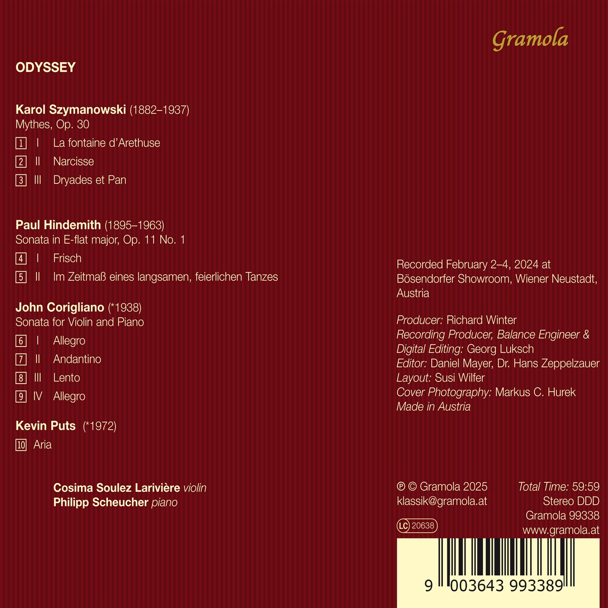 Unter dem Titel „Odyssey“ führen uns die französisch-niederländische Geigerin Cosima Soulez Larivière und der österreichische Pianist Philipp Scheucher durch eine sagenumwobene Welt, beginnend mit Karol Szymanowskis „Mythen“ op. 30. Die drei stark vom Impressionismus geprägten Sätze „Arethusa“, „Narcissus“, „Dryaden und Pan“ greifen auf Motive aus der griechischen Mythologie zurück und gelten aufgrund ihrer verschiedenen innovativen Spieltechniken als Meilenstein im Duo-Repertoire für Violine und Klavier. Auch die folgende zweisätzige Sonate in Es-Dur op. 11 Nr. 1 von Paul Hindemith ist vom Impressionismus beeinflusst, wobei Hindemiths sehr spezifische, einfache und ‚klassische‘ Musiksprache jederzeit deutlich durchscheint. Die Sonate für Violine und Klavier des amerikanischen Komponisten John Corigliano aus den Jahren 1962/63 besticht durch ihre vielfältigen Stimmungen, die durch beeindruckend virtuose sowie lyrische oder komplexe rhythmische Elemente unterstrichen werden. Den Abschluss bildet die atemberaubende „Aria“ seines Landsmannes Kevin Puts, der als ‚Meister des Polystils‘ bezeichnet wird und in den letzten Jahren mit seiner neuesten Oper „The Hours“ große Erfolge feierte.